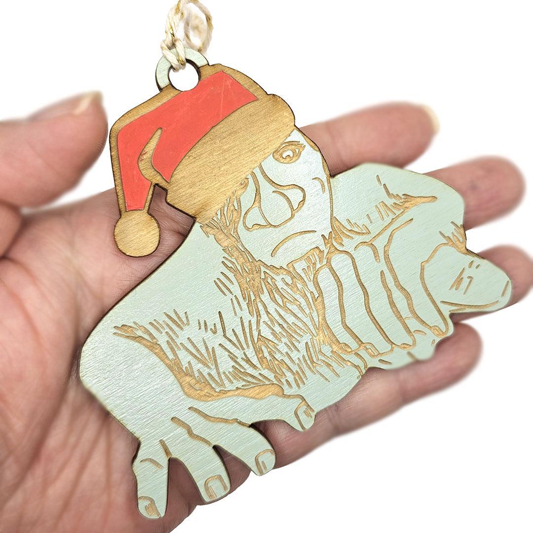 A larger laser-cut wood ornament with the Fremont Troll in a Santa hat.
