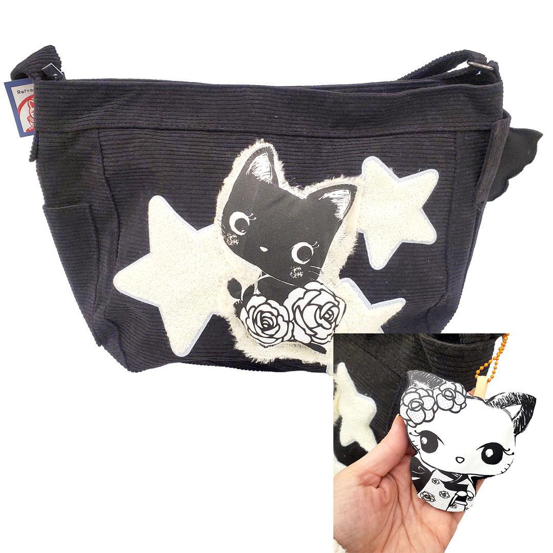 A roomy black corduroy bag with a cat accent and plush geisha kitty friend.