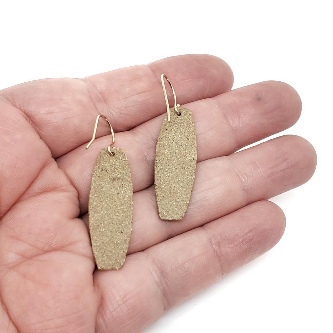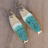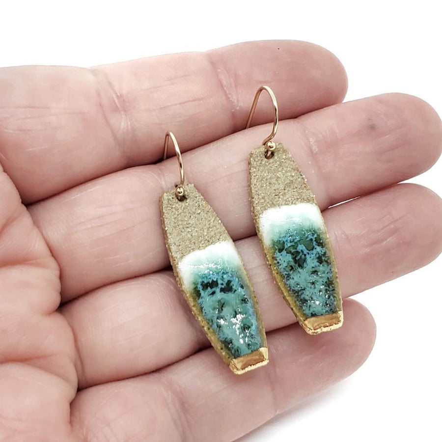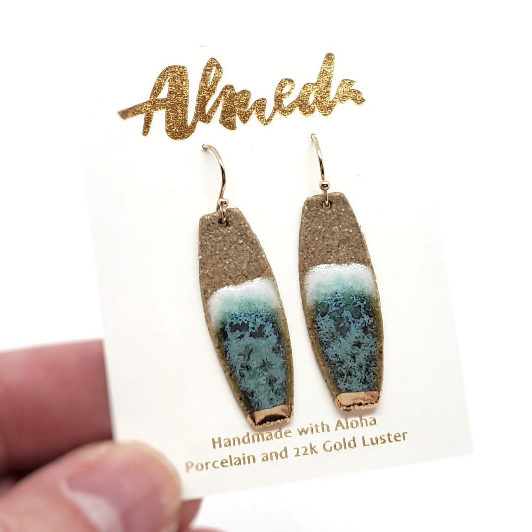 These elegant drop earrings feature slightly curved elongated board shapes in richly textured stoneware ceramic with blue and white glaze accented with 22k gold luster, all hanging on 14k gold-fill ear wires. Almeda Jewelry’s porcelain and stoneware ceramic pieces are a textural delight as well as a loving homage to Hawaii’s natural splendor.