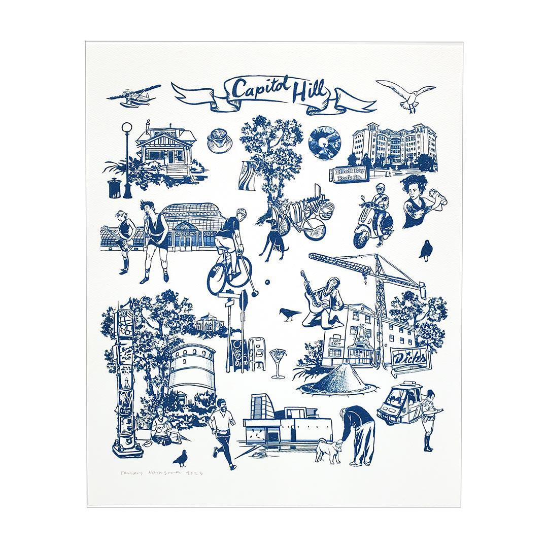 Everything we love about Capitol Hill is right here on this 11.5 x 14 art print including notable landmarks.