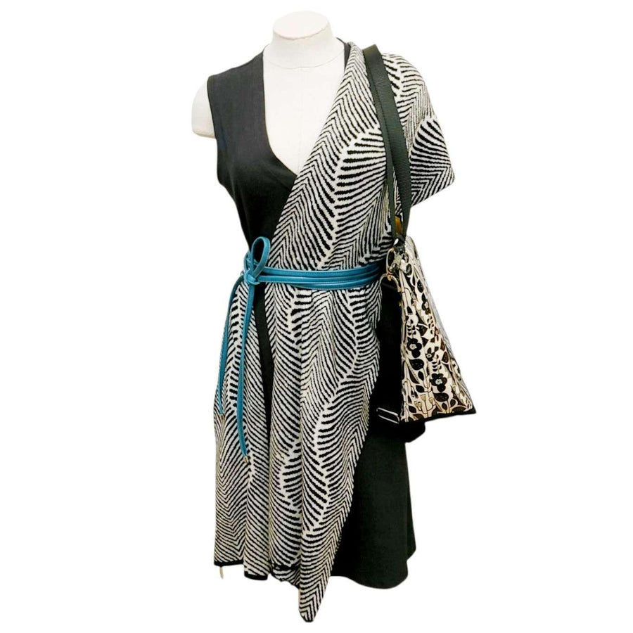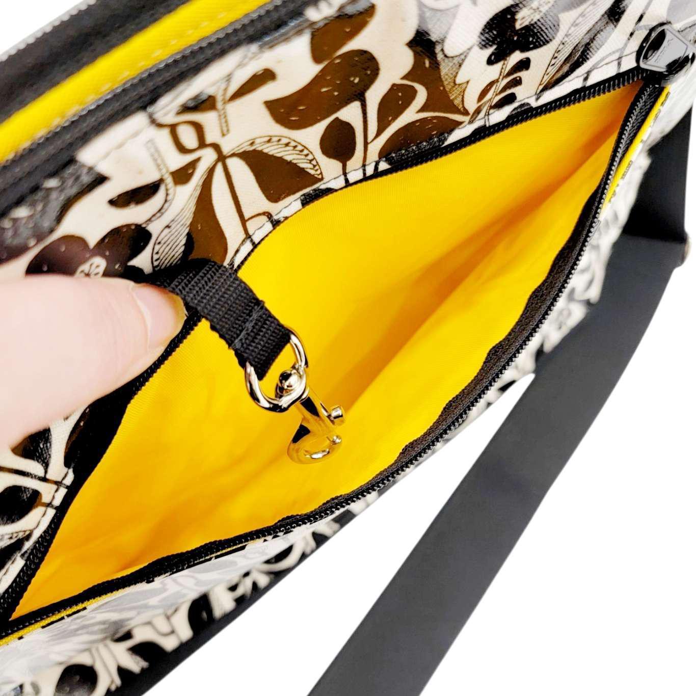 This roomy tote bag features a design of black stylized flowers on a linen background and is convertible from shoulder bag to cross-body, with a bonus external pocket that can be unzipped at the bottom for sliding onto the handles of a rolling suitcase.