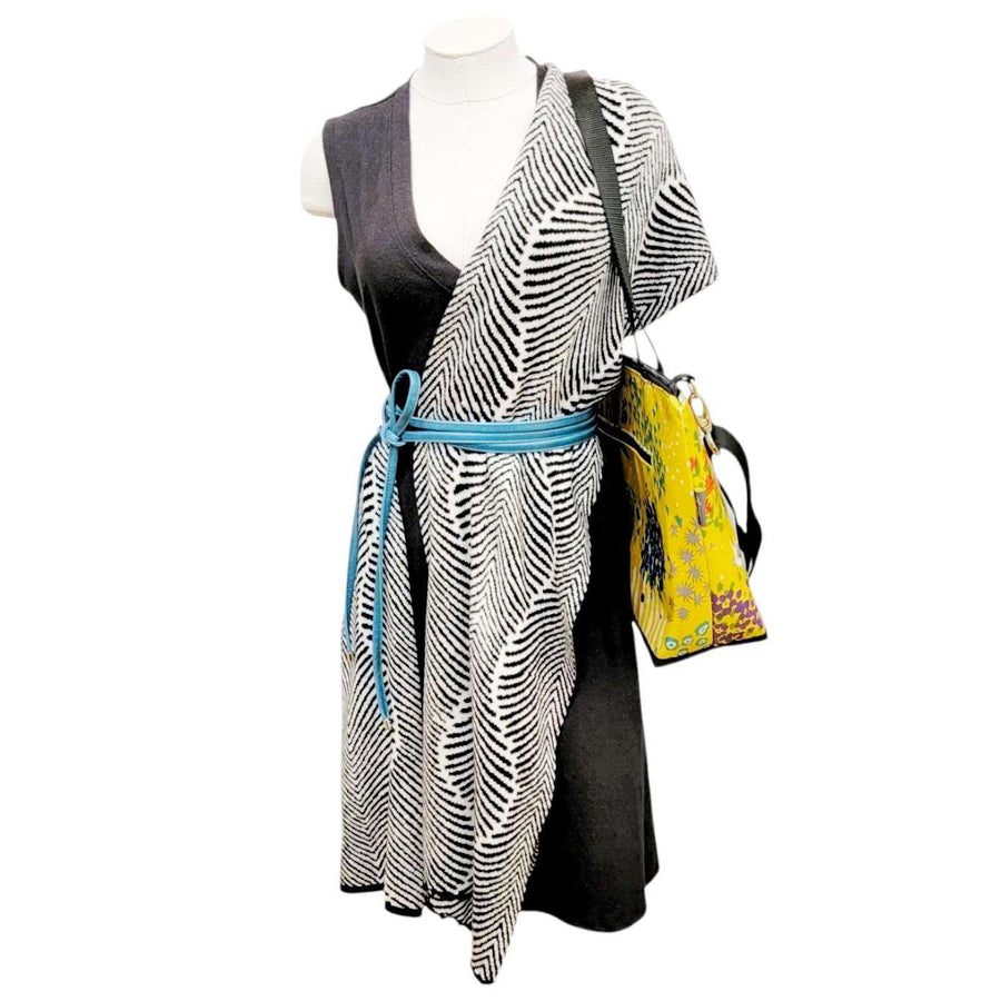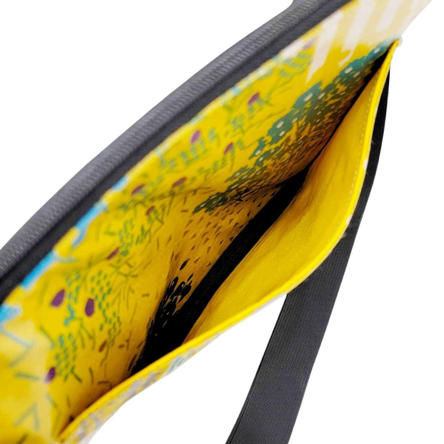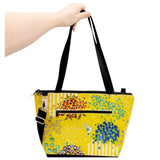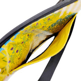 This roomy tote bag features a design of colorful flowers on a golden yellow background and is convertible from shoulder bag to cross-body, with a bonus external pocket that can be unzipped at the bottom for sliding onto the handles of a rolling suitcase.