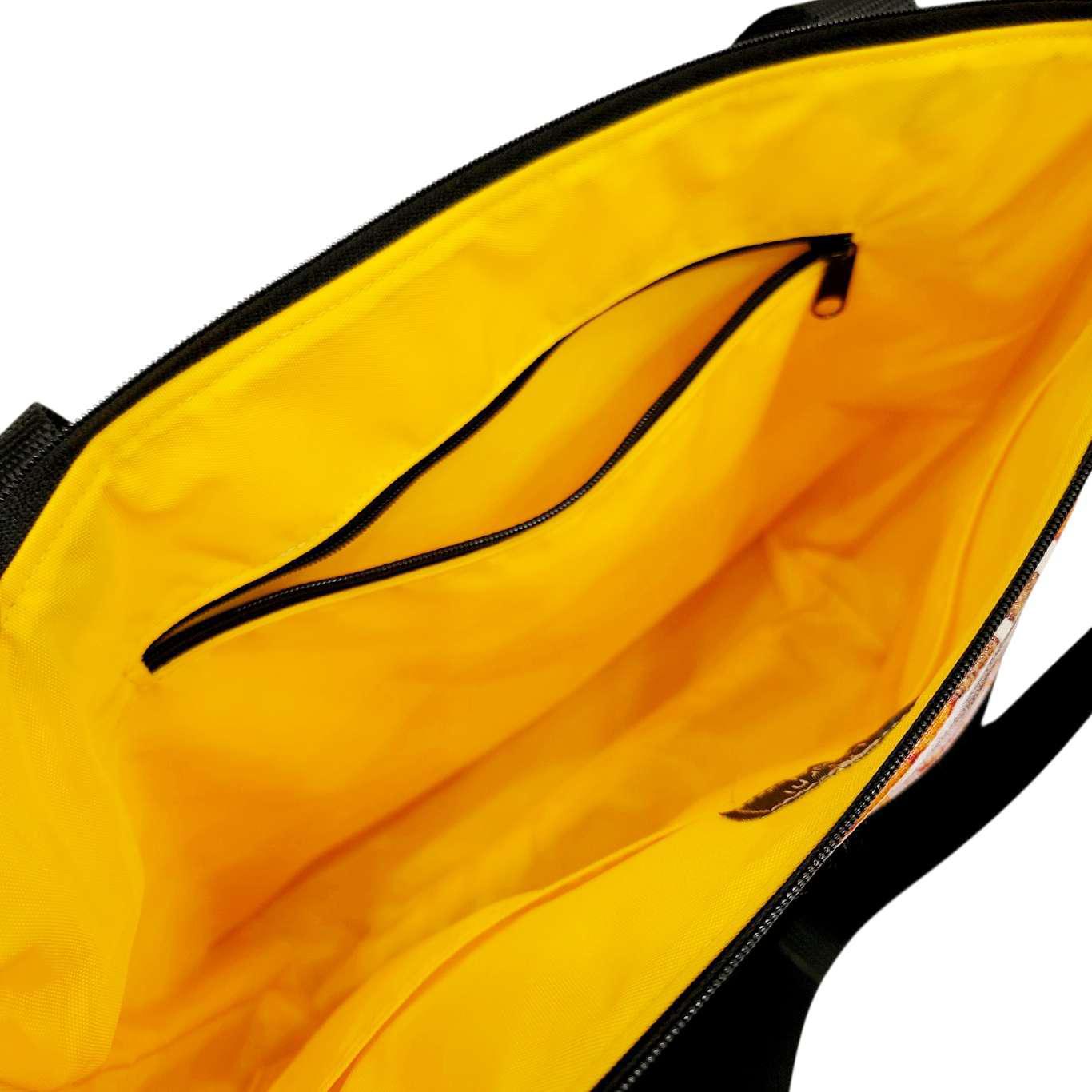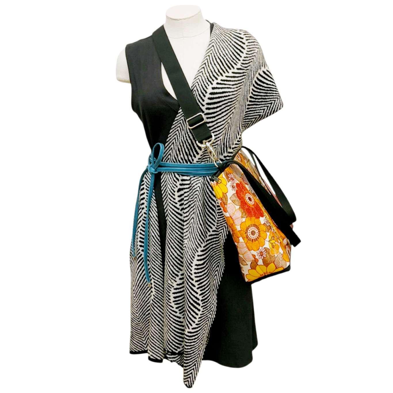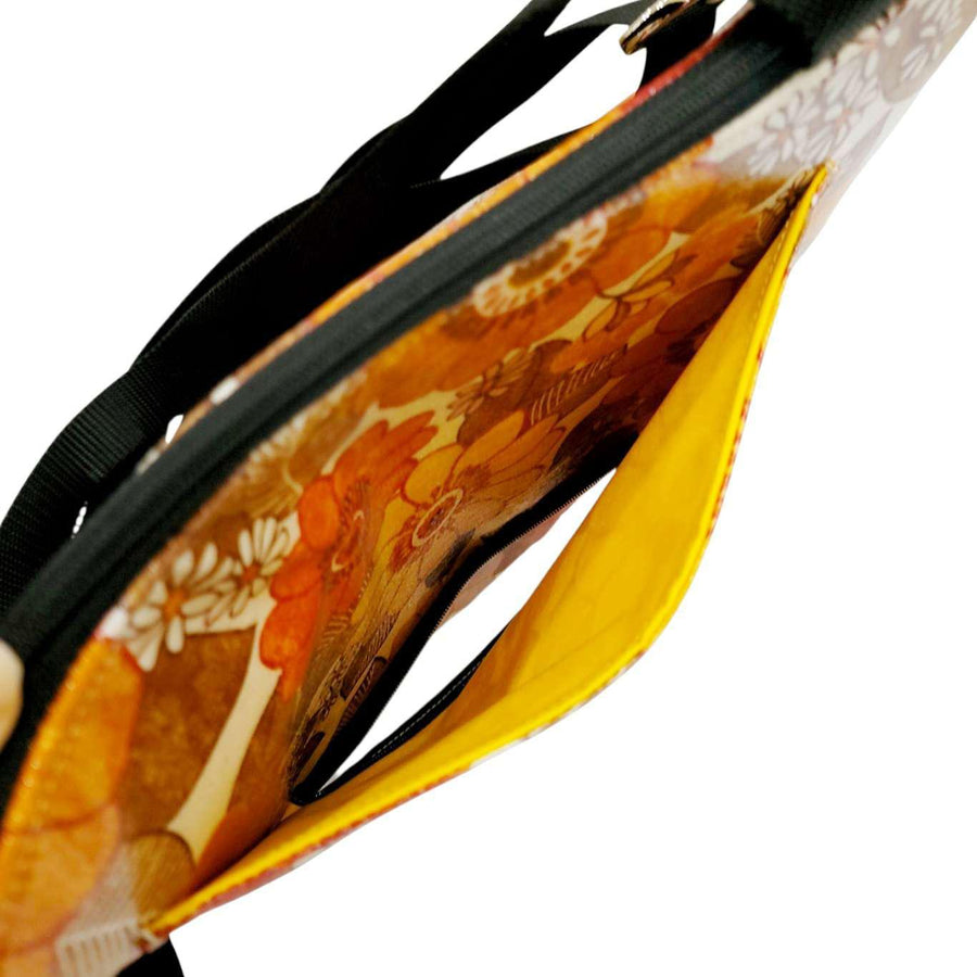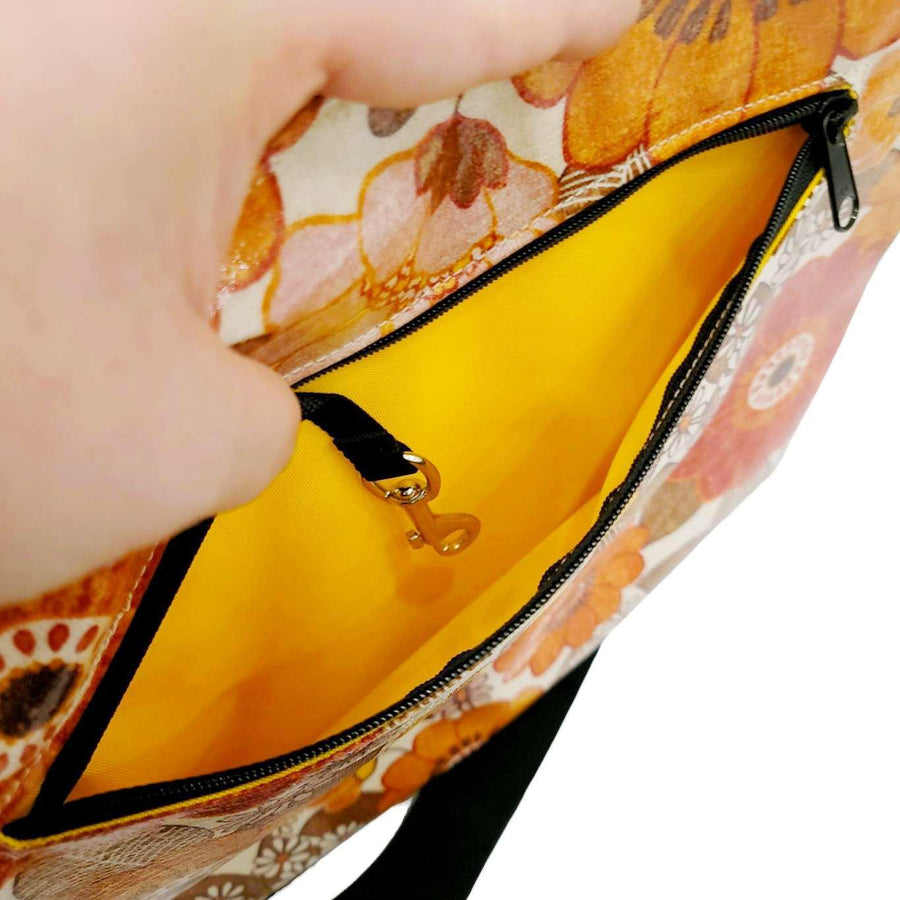 This roomy tote bag features a design of 70s-style flowers in orangey earth tones on a linen background and is convertible from shoulder bag to cross-body, with a bonus external pocket that can be unzipped at the bottom for sliding onto the handles of a rolling suitcase.