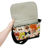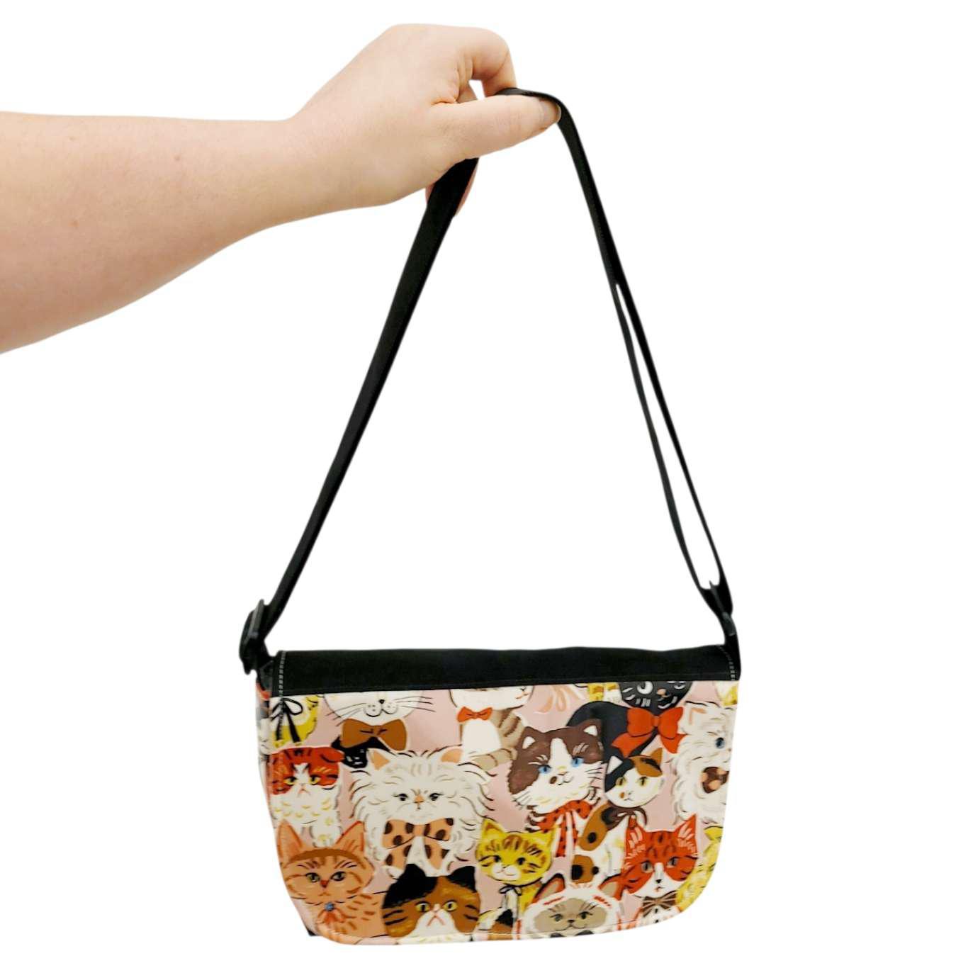 This short messenger bag features a design of cats wearing bows against a soft pink background.