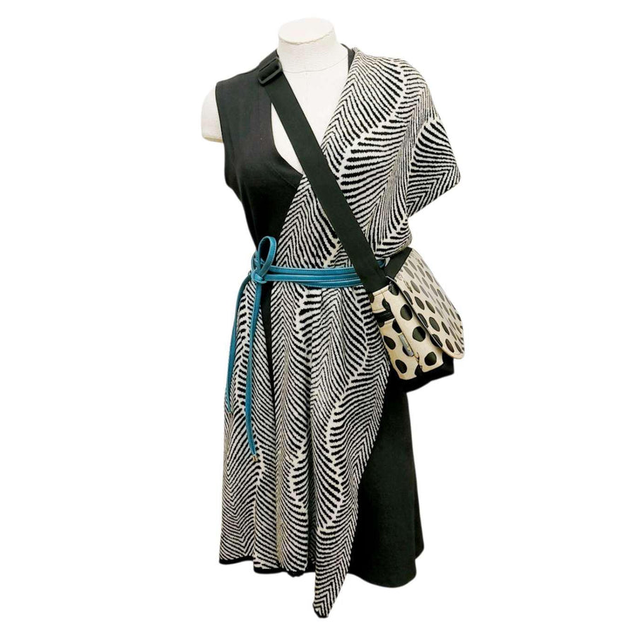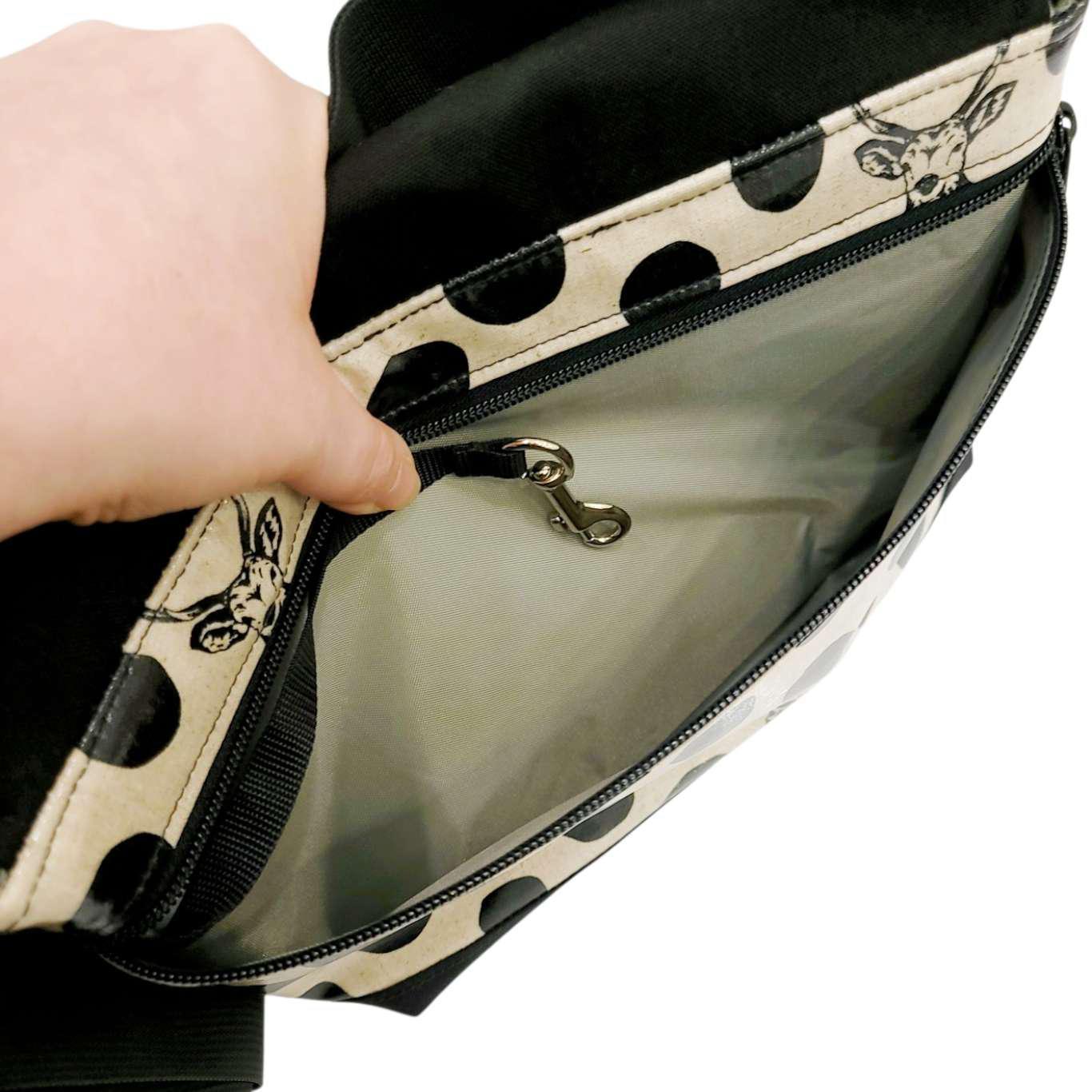 This short messenger bag features a design of large black dots and deer (some of them with glasses!) against a linen background.