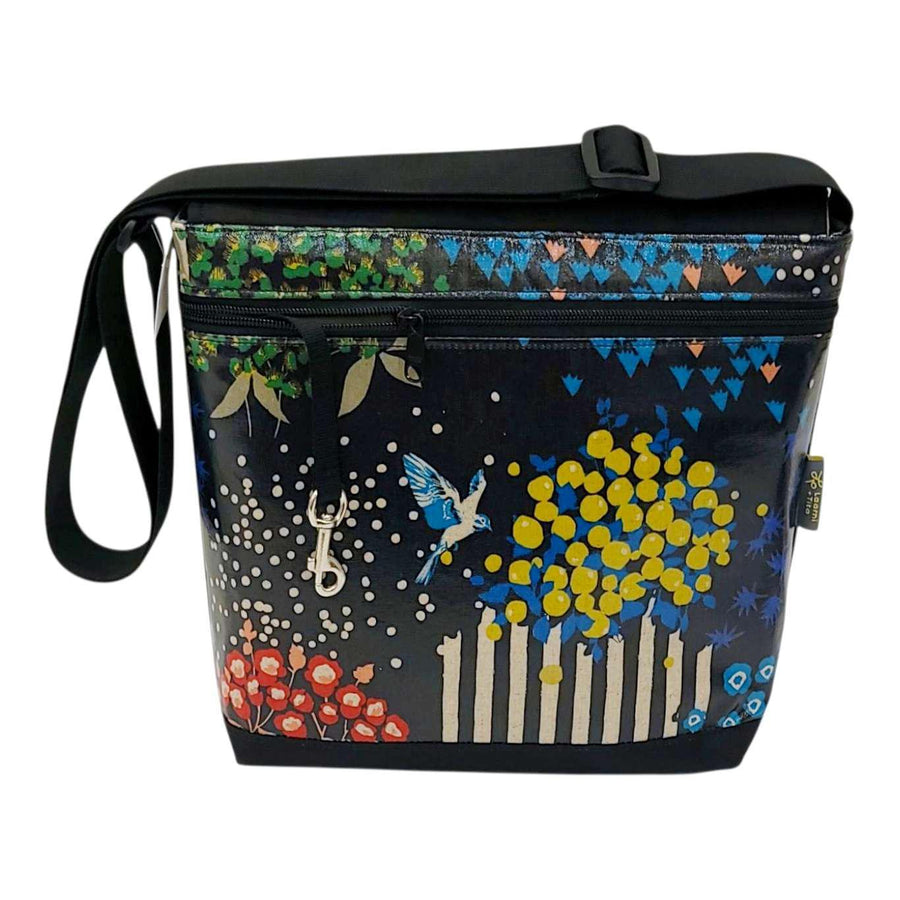 This tall messenger bag features laminated canvas with colorful flowers with happy lil Blue Bird on Black.