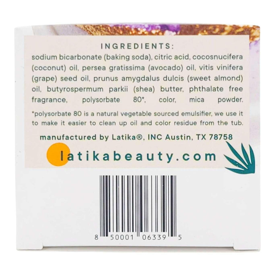 - Ingredients - Sodium bicarbonate (baking soda), citric acid, cocos nucifera (coconut) oil, persea gratissima (avocado) oil, vitis vinifera (grape) seed oil, prunus amygdalus dulcis (sweet almond) oil, Butyrospermum parkii (shea) butter, phthalate free fragrance, color, salt, polysorbate 80. Polysorbate 80 is a natural vegetable sourced emulsifier, and is used to make it easier to clean up oil and color residue from the tub. Sodium lauryl sulfate (SLS)-free, paraben-free, and phthalate-free.