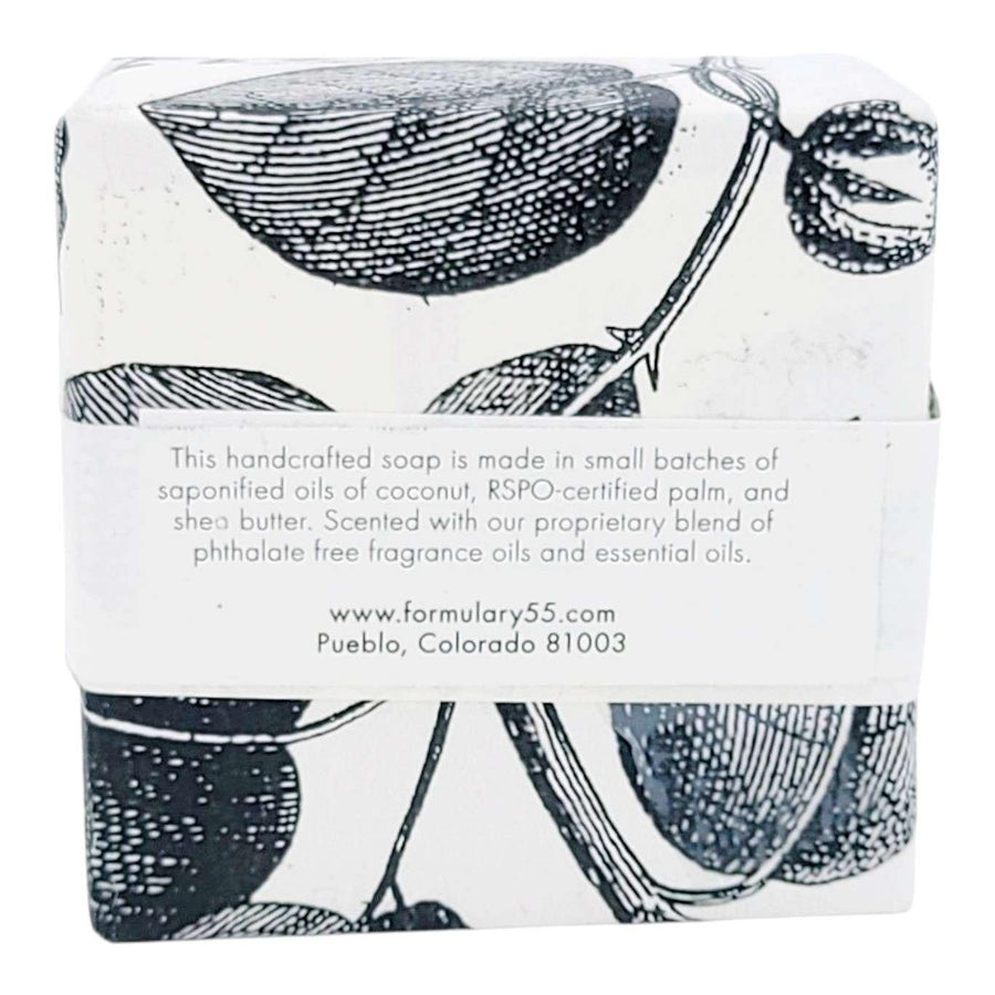 Ingredients: This handcrafted soap is made in small batches of saponifed oils of coconut, RSPO-certified palm, and shea butter. Scented with our own proprietary blend of phthalate free fragrance oils and essential oils. All of Formulary 55 products are made in the USA, vegan, certified cruelty-free, SLS-free, and paraben free