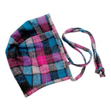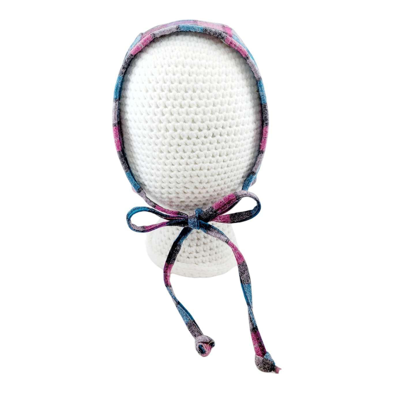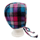 An adorable baby bonnet in pink and blue plaid Pendleton wool with an under-chin tie to keep your little one snug and secure!