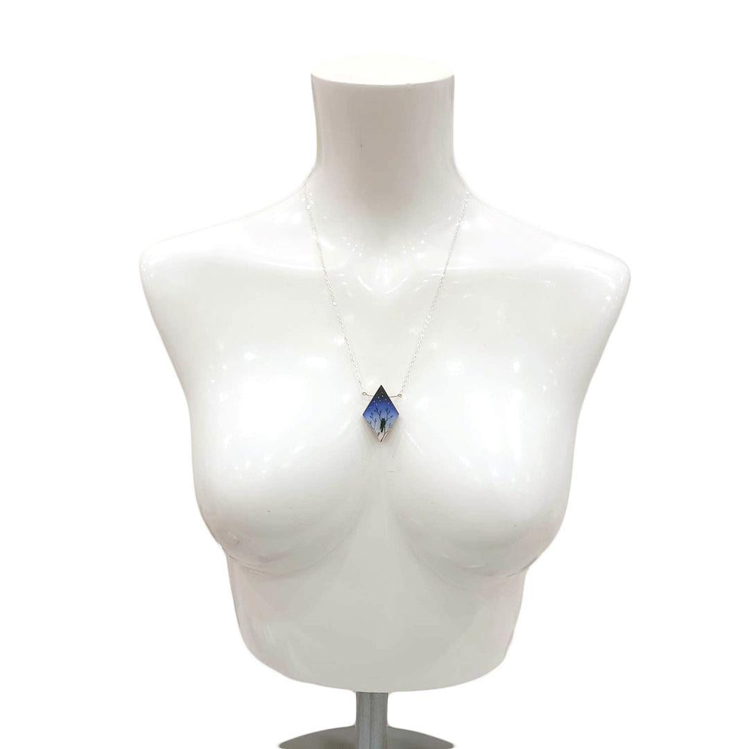 A kite-shaped pendant hanging from a bar of bright sterling silver features a mysterious owl hiding amongst silhouetted branches under a starry cobalt blue night sky.