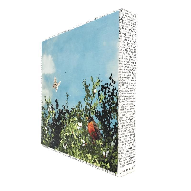 The block edges and backside are covered with vintage book pages, and the block is sealed with multiple layers of non-toxic matte varnish and signed on the reverse. It has a keyhole opening in the back for ease of hanging.