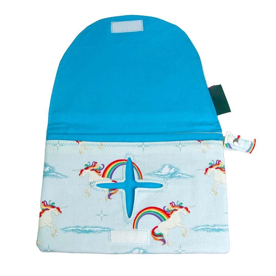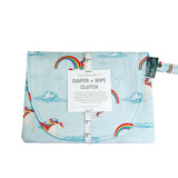 Unicorns and rainbows dance across a sky blue background on this portable Diaper + Wipe Clutch keeps your diapers and wipes all in one place when on the go!