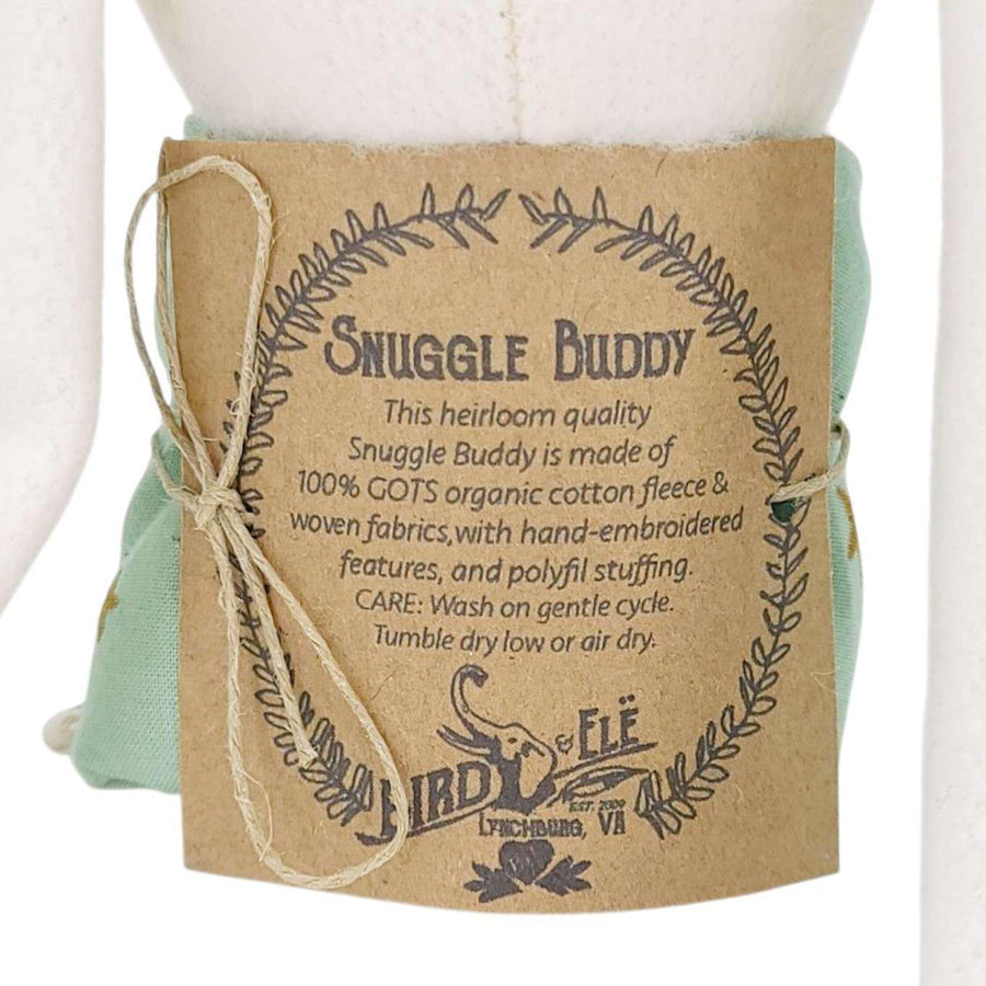 This sweet bunny lovey features soothing Starry Frost print fabric on the ears and back, with snuggly soft unbleached cotton on the rest of the body and embroidered noses and sleepy eyes.