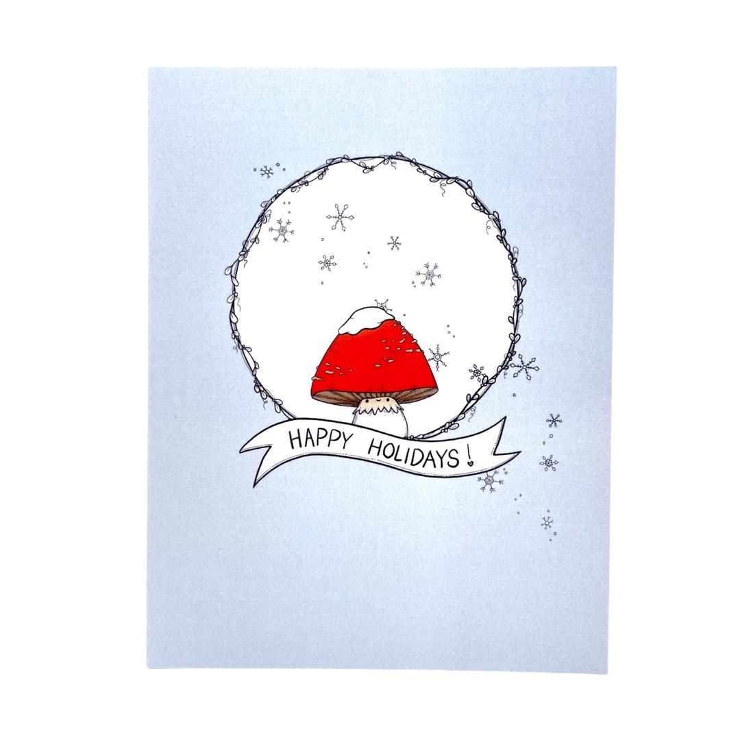 Set of six Happy Holiday cards featuring a happy snow-capped red amanita mushroom in a wreath on a blue background with a flurry of snowflakes with a banner below that reads, "Happy Holidays!"