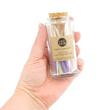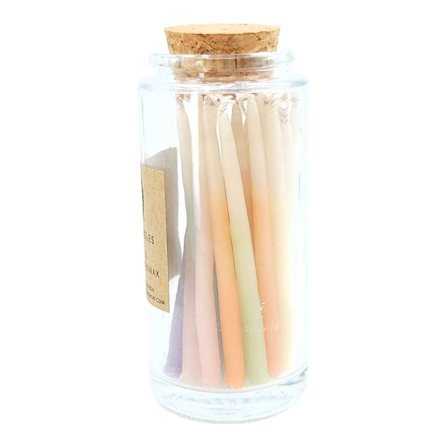 These 100% beeswax birthday candles are hand-dipped, have a light natural beeswax scent, and are beautifully packaged in a small glass apothecary cork-sealed jar.