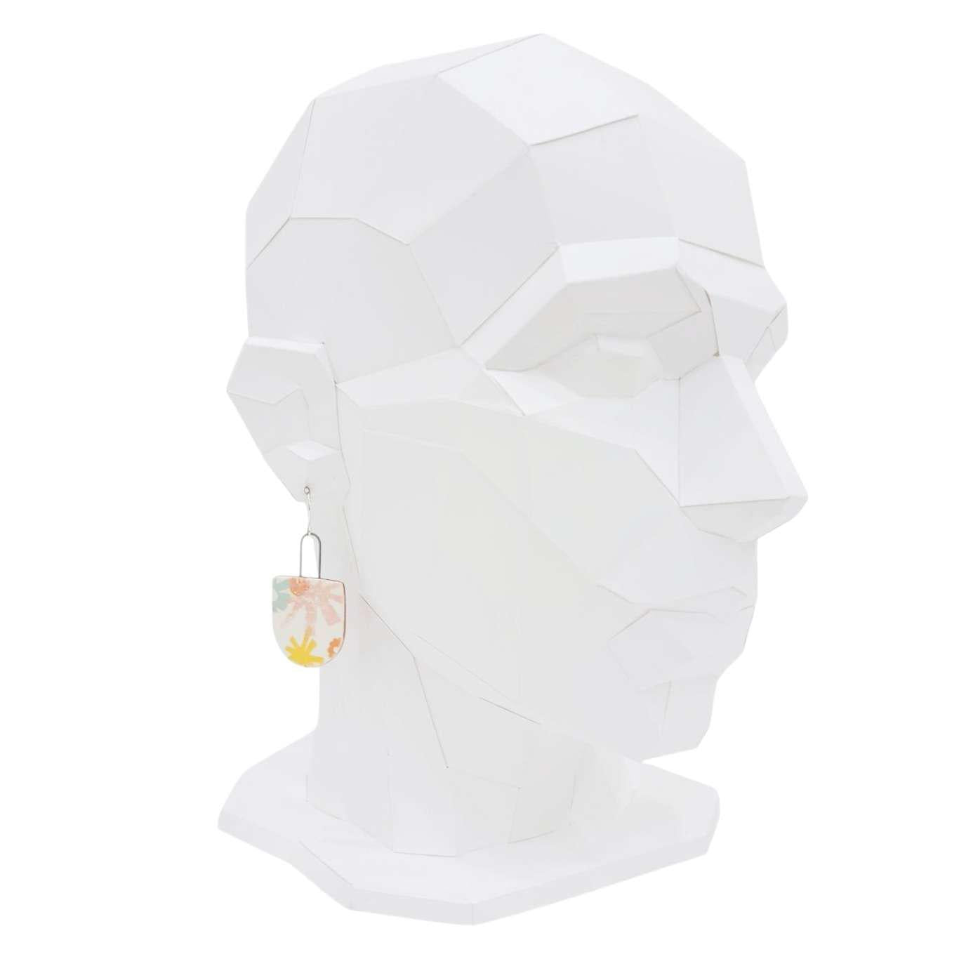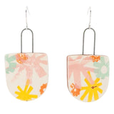 - Ceramic earrings in a cutout inverted arch shape with a colorful abstract floral design