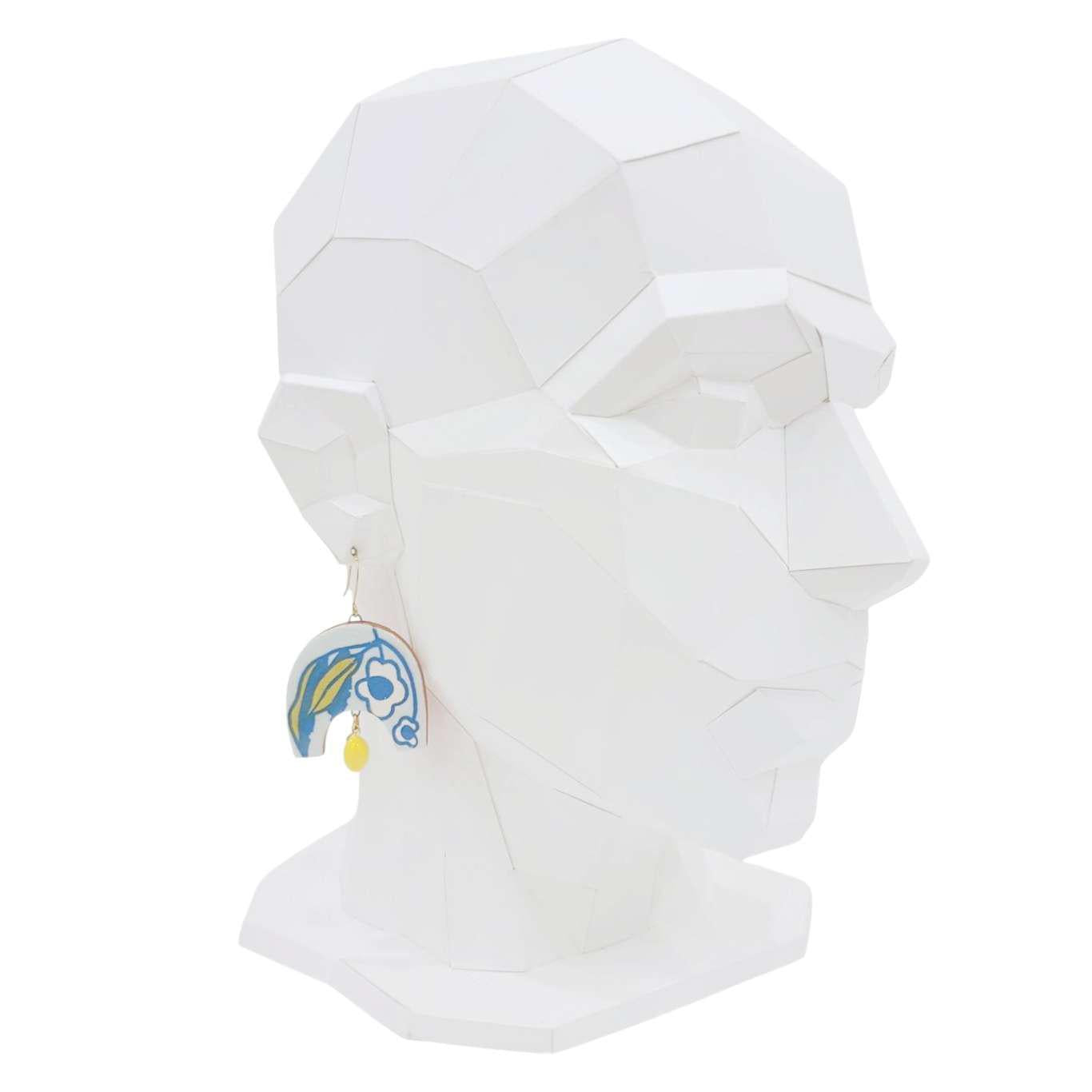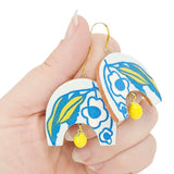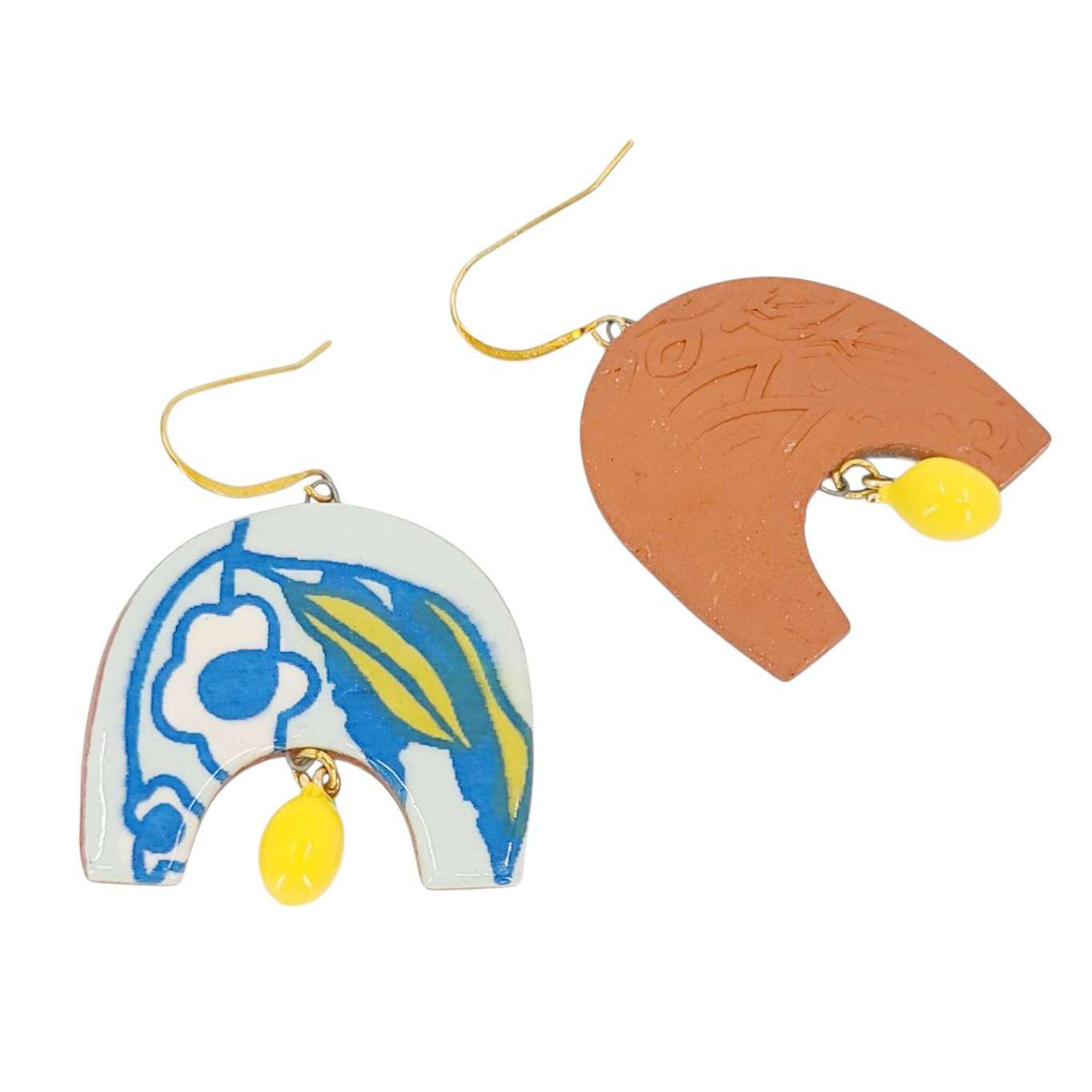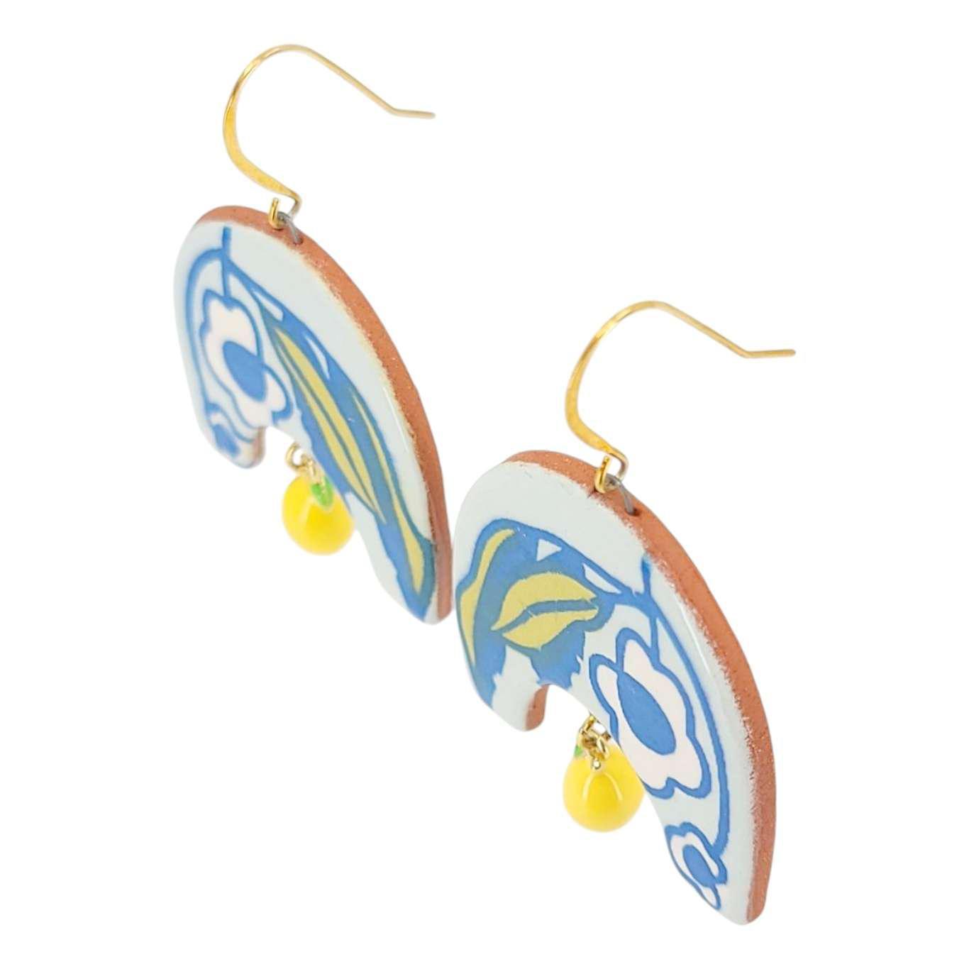 - Large (but not heavy!) ceramic earrings in a cutout arch shape with a floral design and a small lemon charm complete with a green leaf
