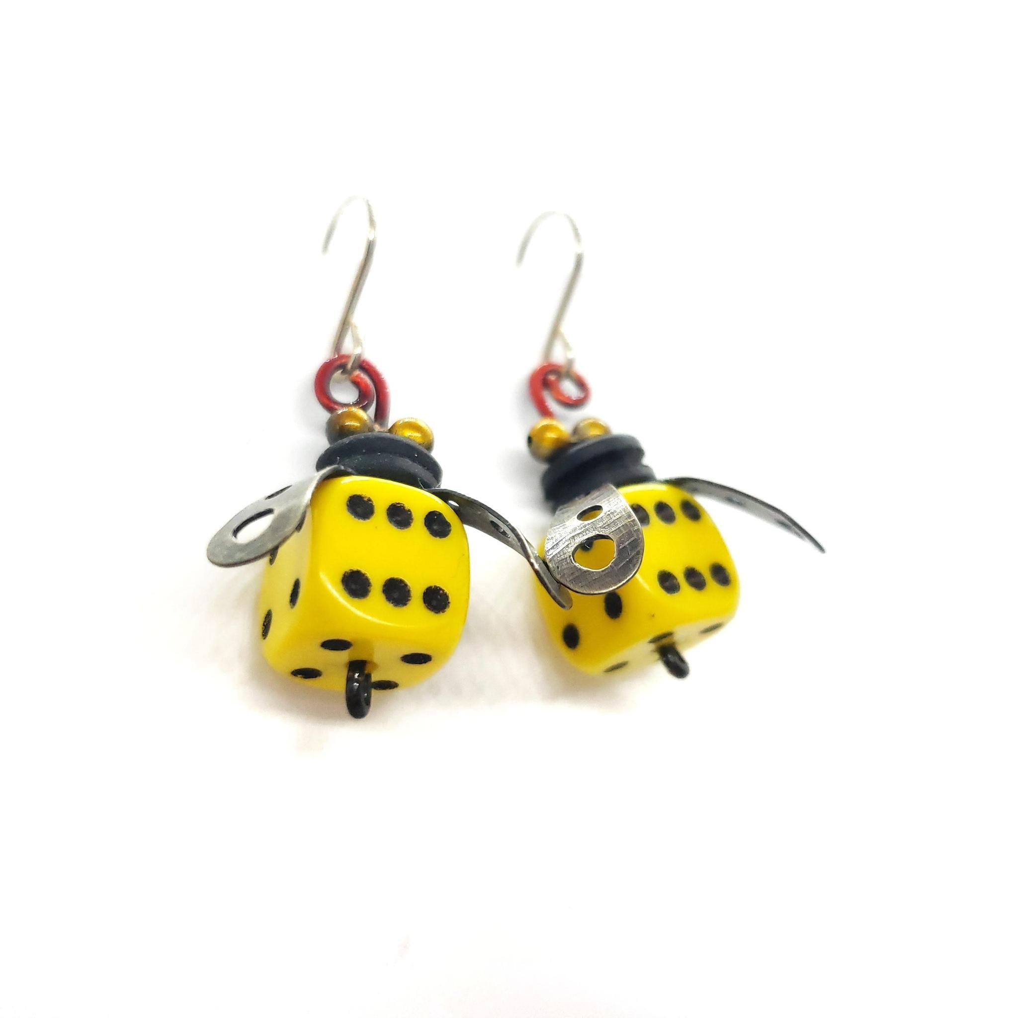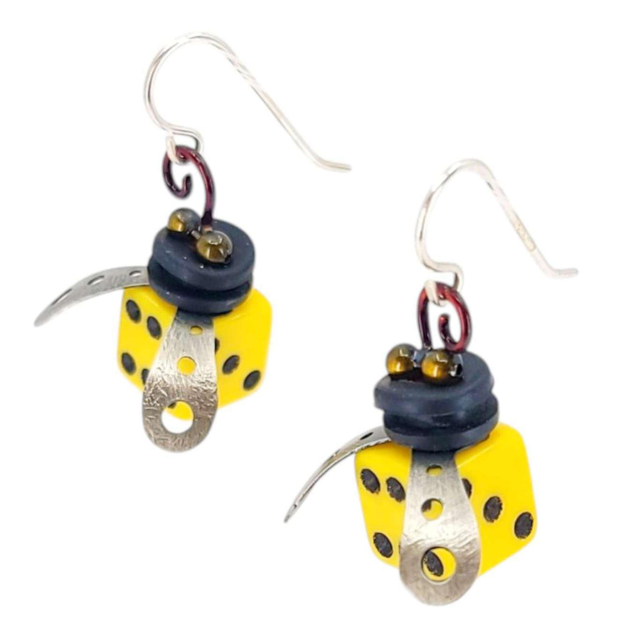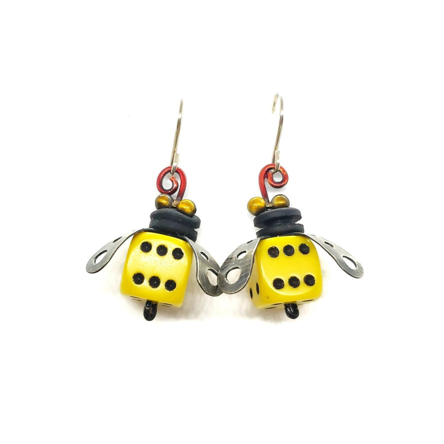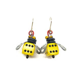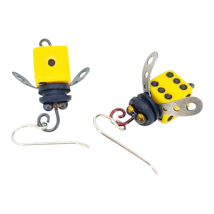 Bright yellow plastic mini dice form the body of these funky bees with a rubber head, brass wings and eyes, and a tiny brass stinger all on sterling silver ear wires. Chickenscratch creates pieces with whimsy, movement, and a funky edge that will set you apart from the crowd!