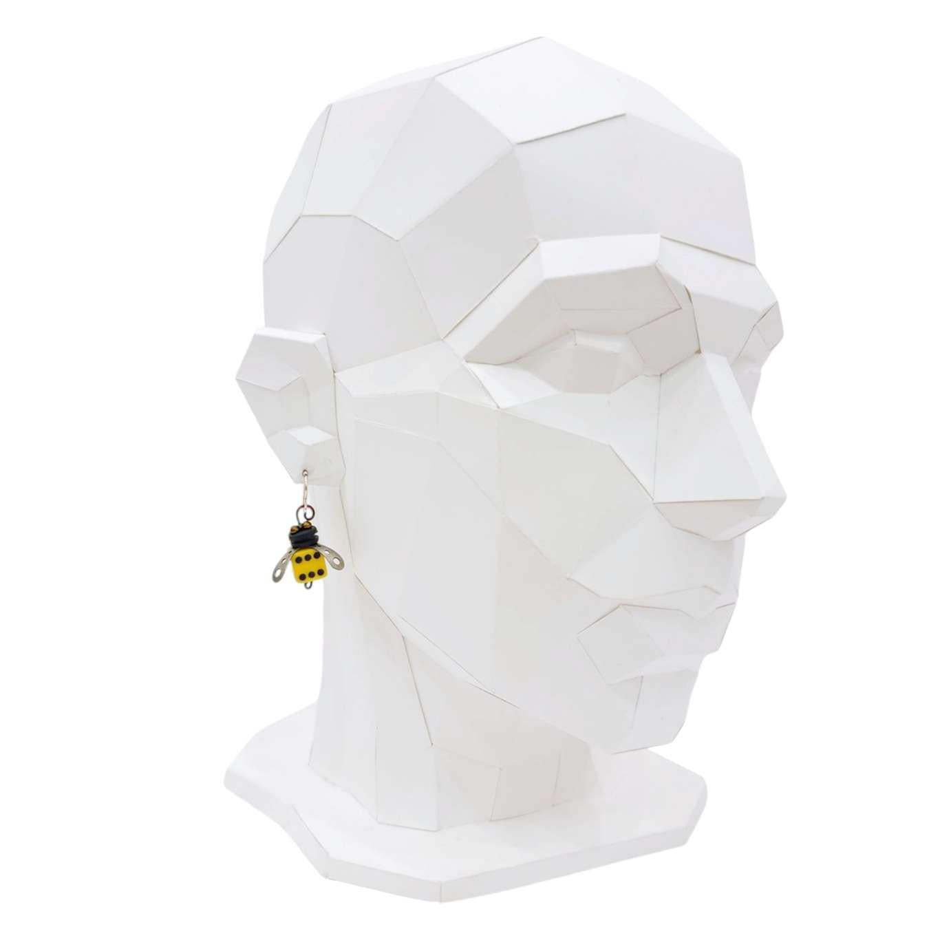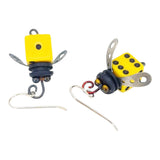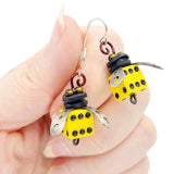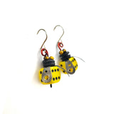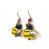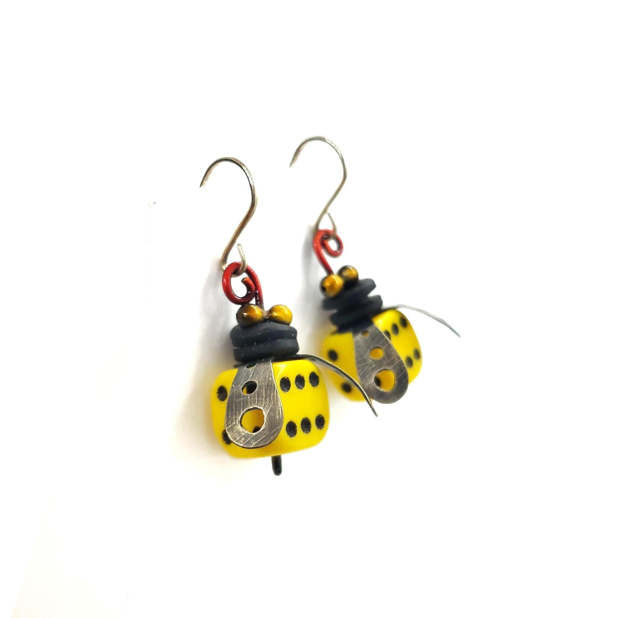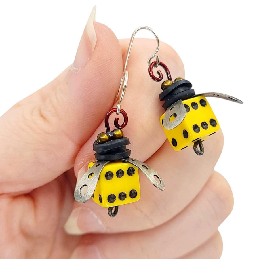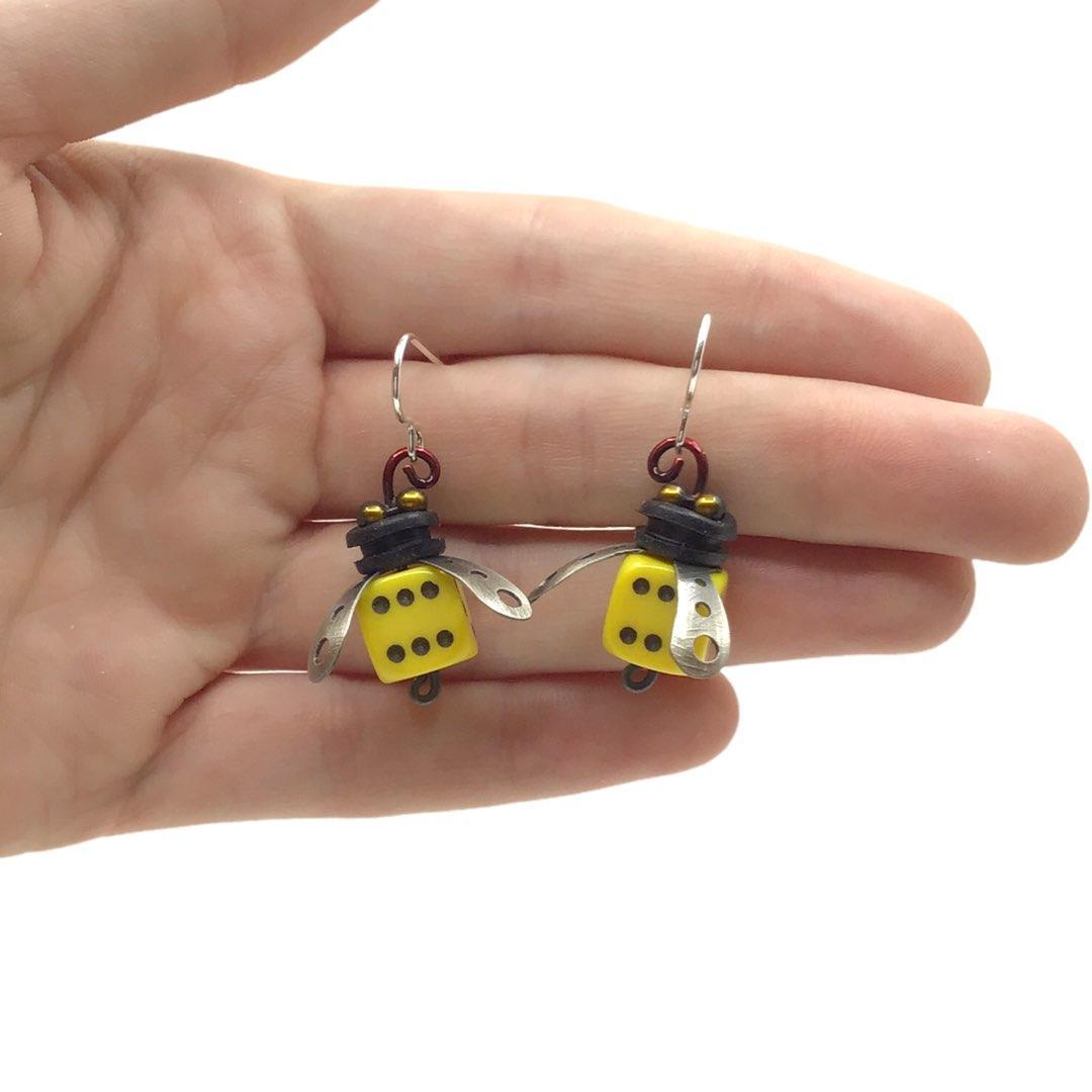 Bright yellow plastic mini dice form the body of these funky bees with a rubber head, brass wings and eyes, and a tiny brass stinger all on sterling silver ear wires. Chickenscratch creates pieces with whimsy, movement, and a funky edge that will set you apart from the crowd!