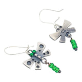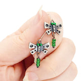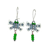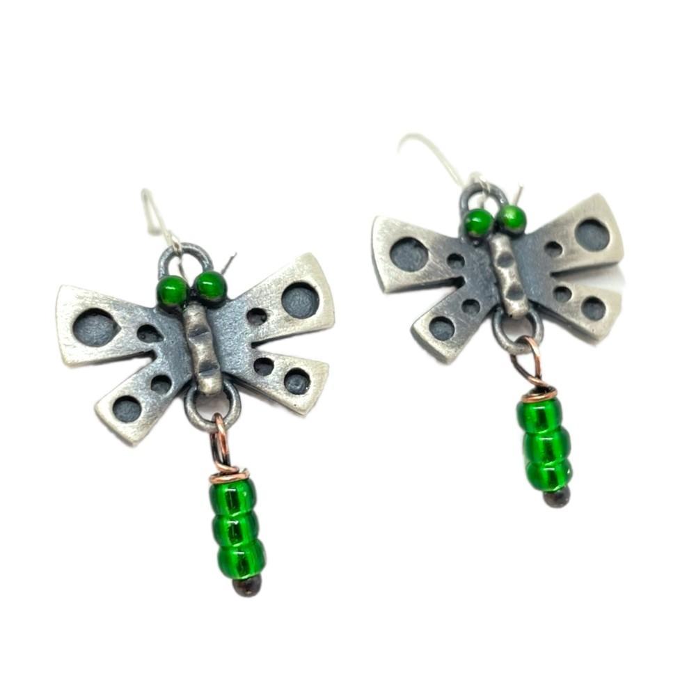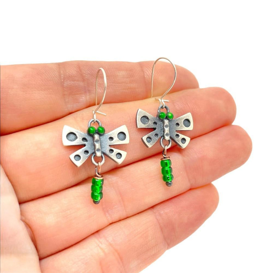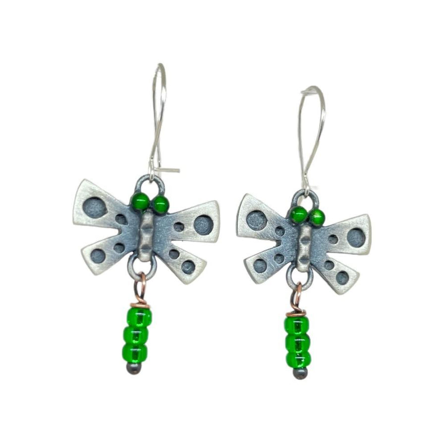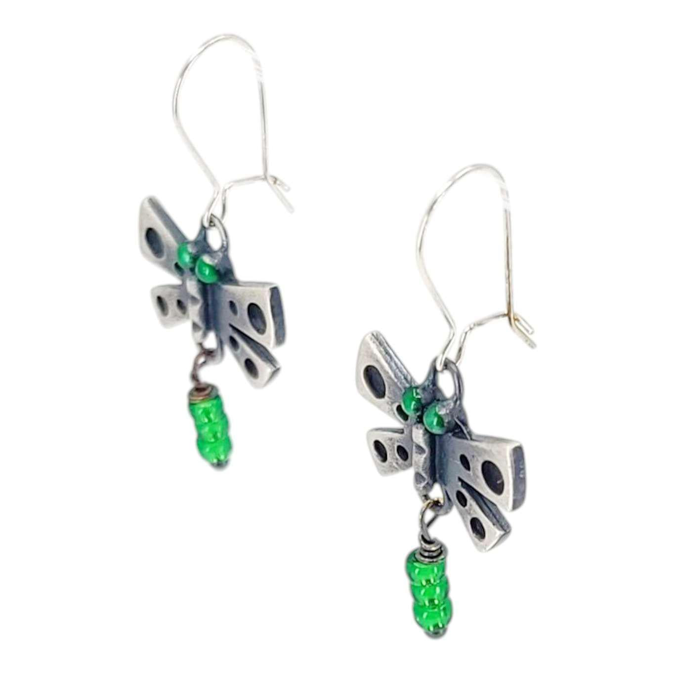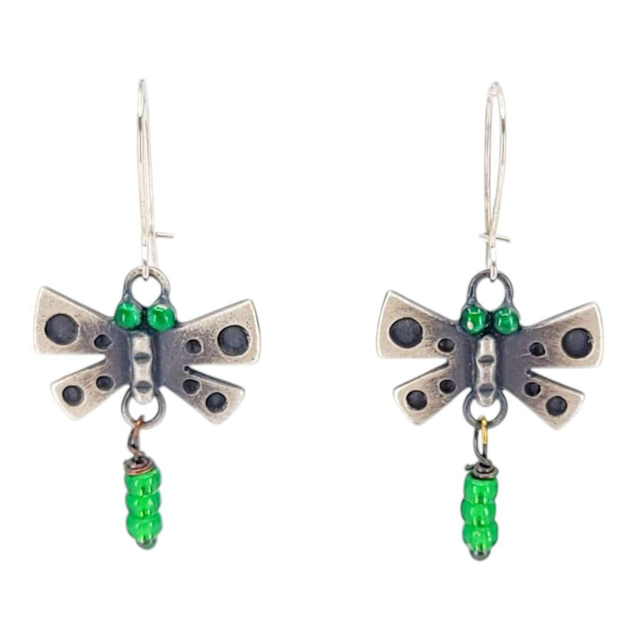 Did you know dragonflies are some of the fiercest hunters in the animal kingdom? Let them add some of that fierceness to your wardrobe with these bold earrings! The front half of the dragonflies are cast in solid sterling silver with green enamel painted eyes, and their distinctive long abdomen is made of green glass beads that are allowed to dangle freely, giving these earrings a great sense of motion. Locking sterling silver ear wires keep these buggy friends securely on your ears.