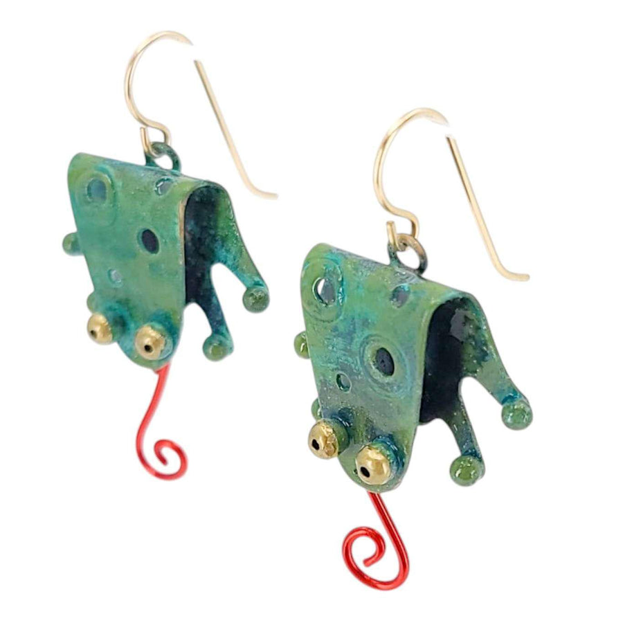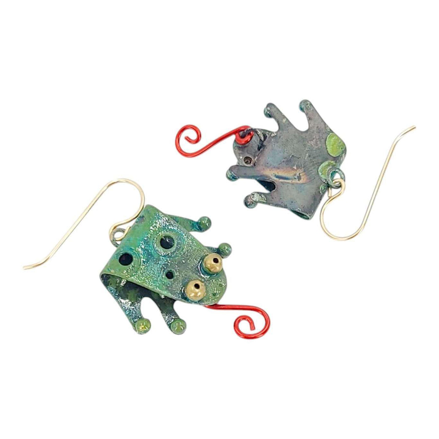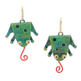 - Verdigris brass frogs with red enamel painted dangling tongues and gold-filled ear wires