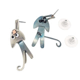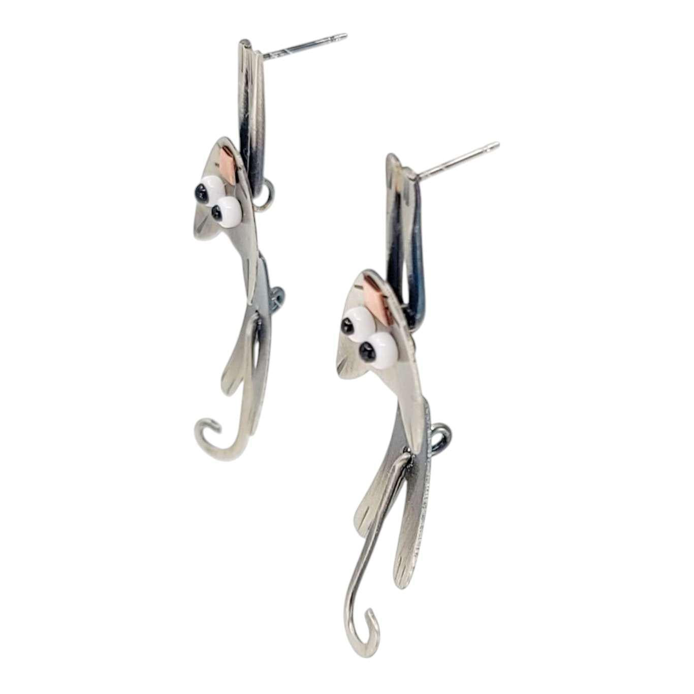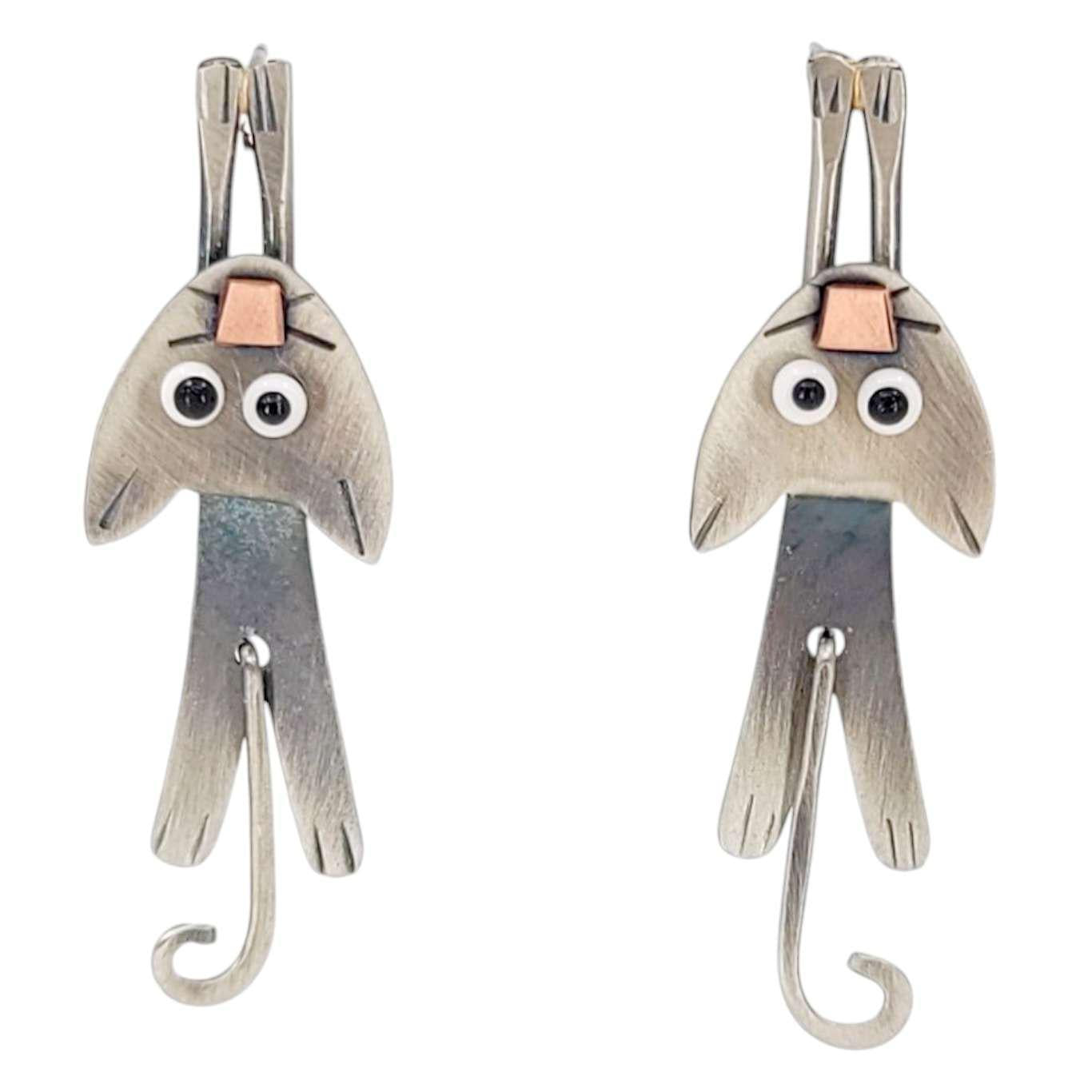 These cute kitties want to help remind you to just hang in there! Articulated nickel silver cats with dangling tails swing on stainless steel ear posts with comfort clutch backs. Chickenscratch creates pieces with whimsy, movement, and a funky edge that will set you apart from the crowd!
