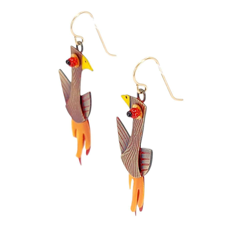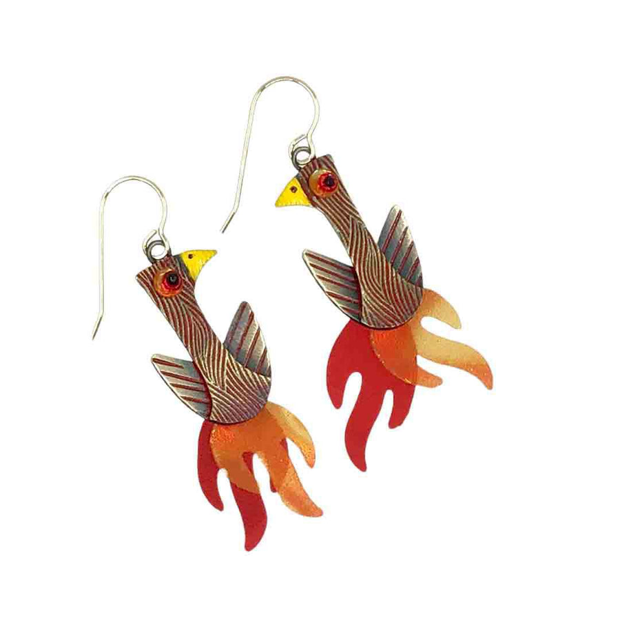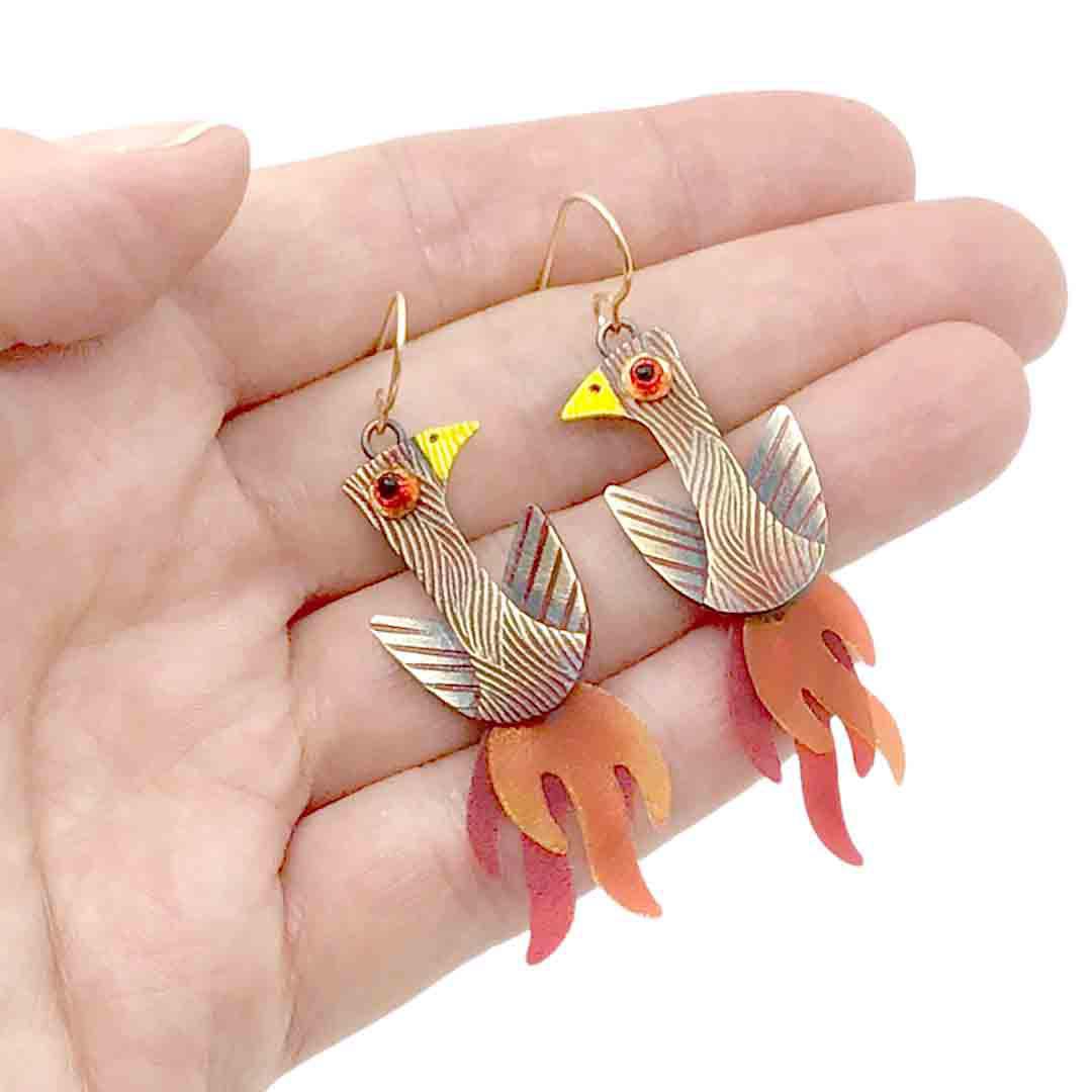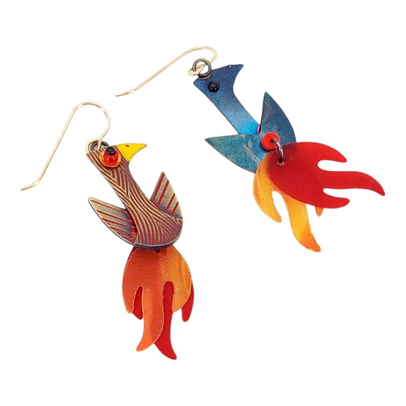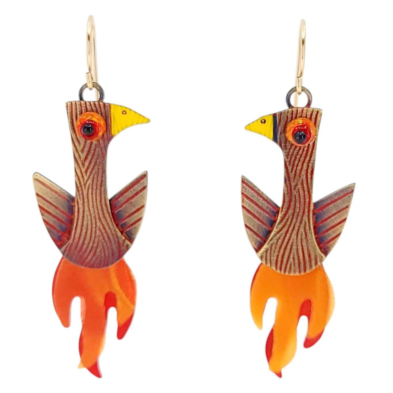 These spectacular birds are rising from the ashes in a wonderful flash of color and flames. Hand made in textured brass they are further antiqued and richly decorated in a deep red enamel. Their fabulous swinging tails are hand made using prismatic plastic sheets in orange and red creating quite a shimmering spectacle! Completed with a red glass bead eye and gold filled ear wires.