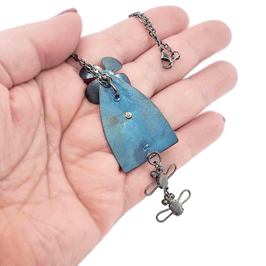 Feel like a queen with this cute bee-themed pendant necklace! Two cast brass bees fly towards a gold-plated skep (domed beehive) on a textured brass and copper background capped with a pretty blue mica powder coated brass flower, all hanging on an 18in gunmetal chain.