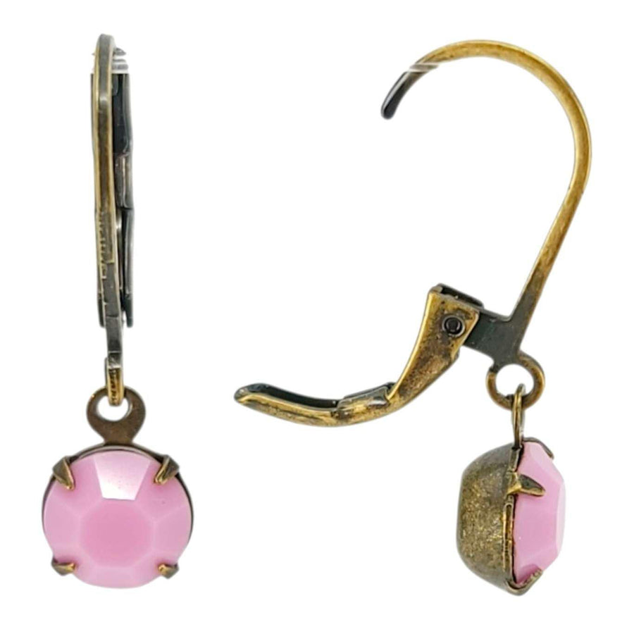 Tiny round vintage rhinestones in sparkly pink opal hang from antiqued brass-plated lever back ear wires.