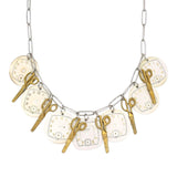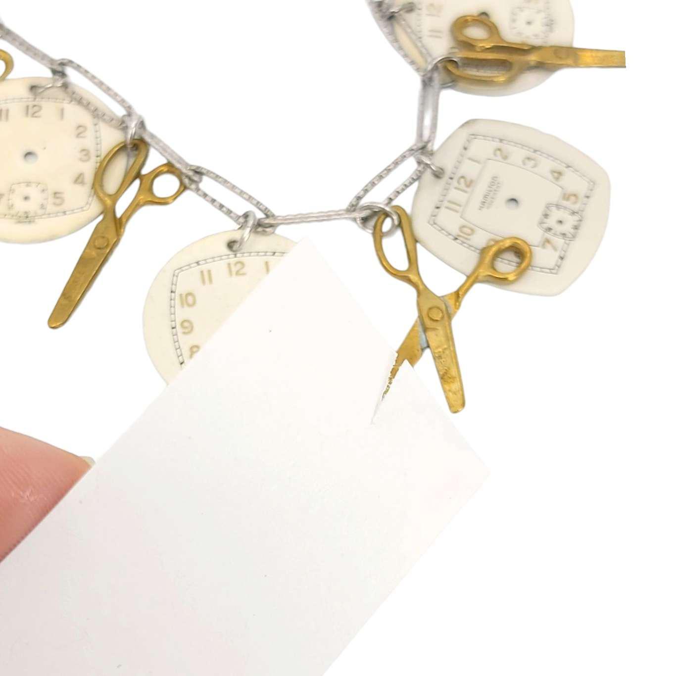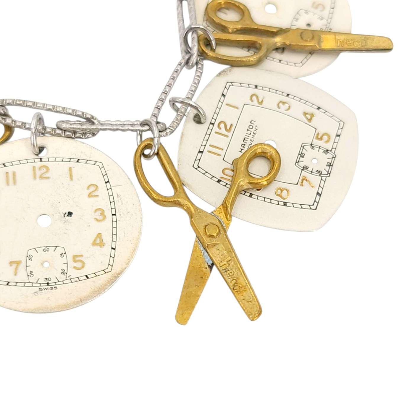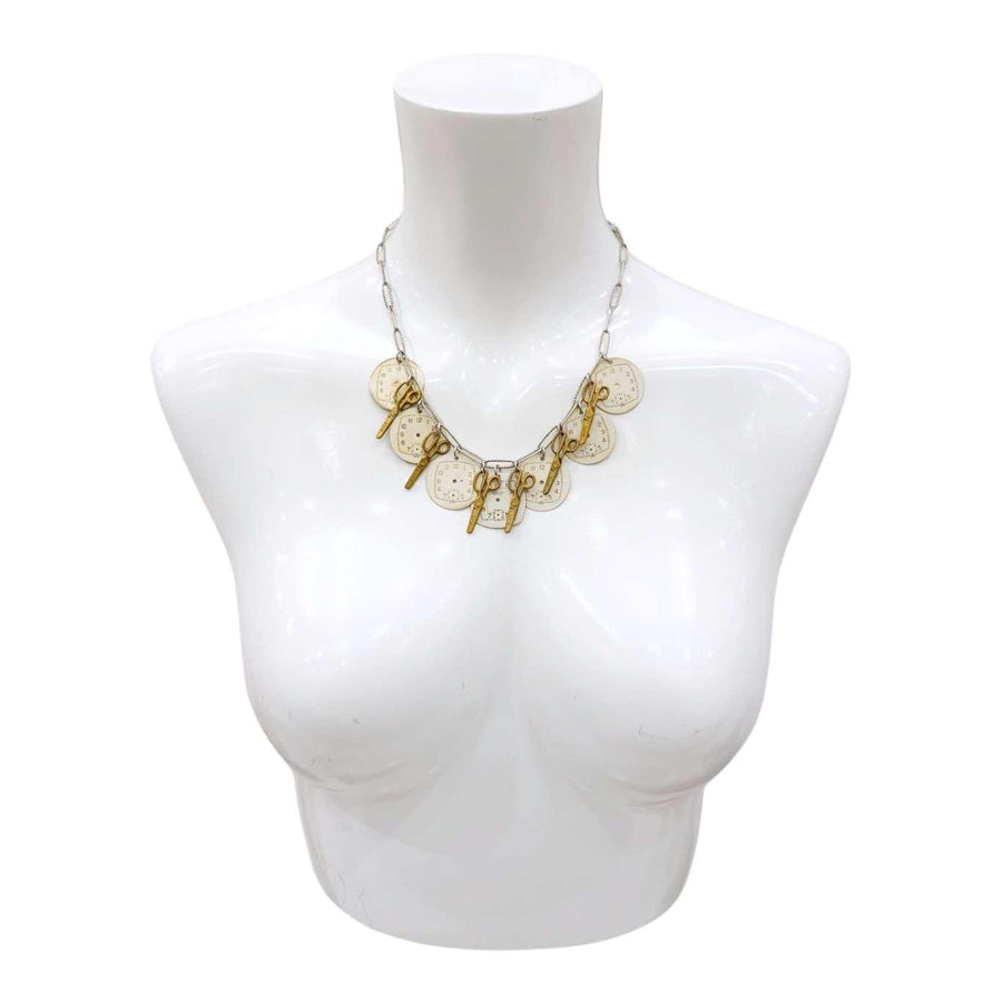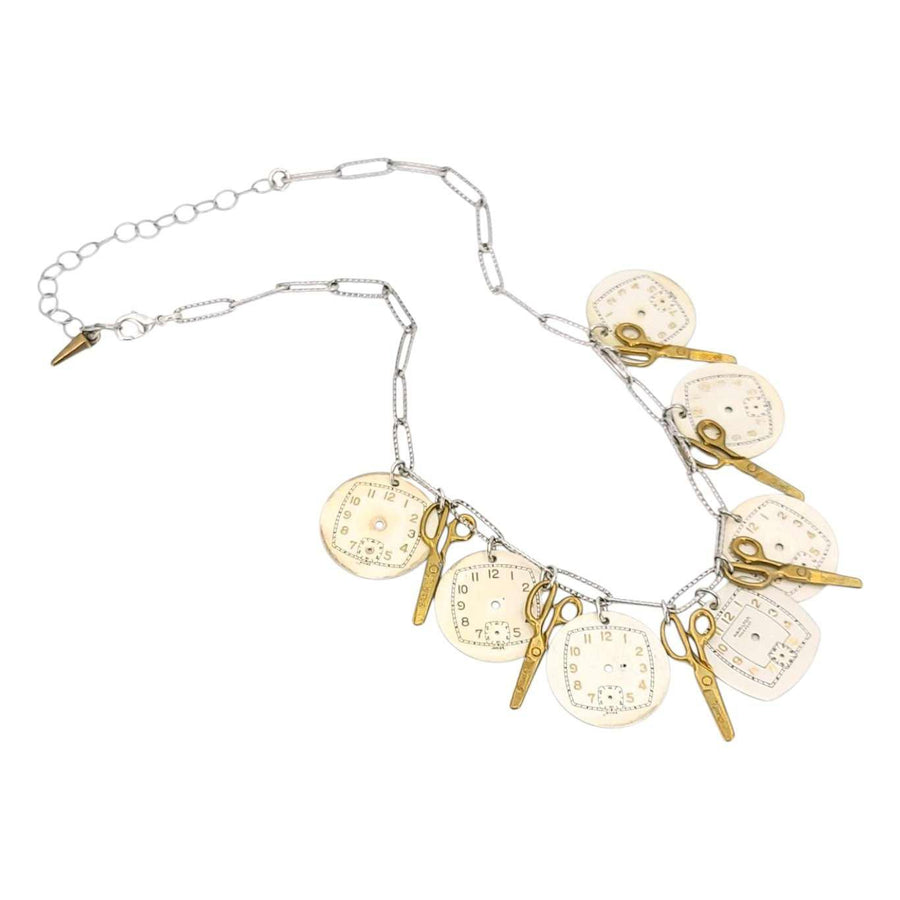 Cutting Time is a statement vintage watch dial necklace with a strand of large vintage watch dials interspersed with vintage miniature brass scissors (they cut paper!!).
