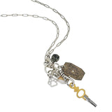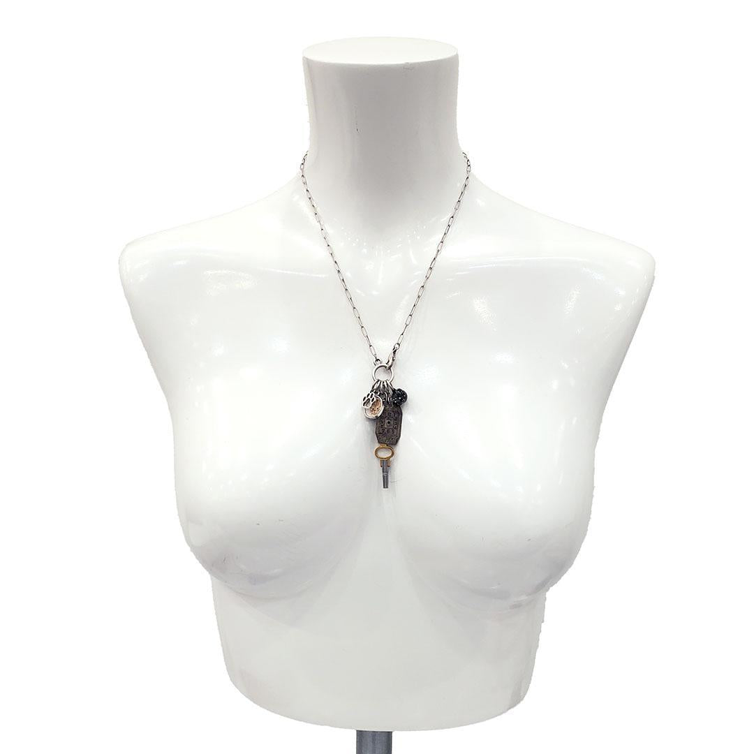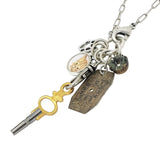 - Necklace featuring collection of charms and vintage pieces