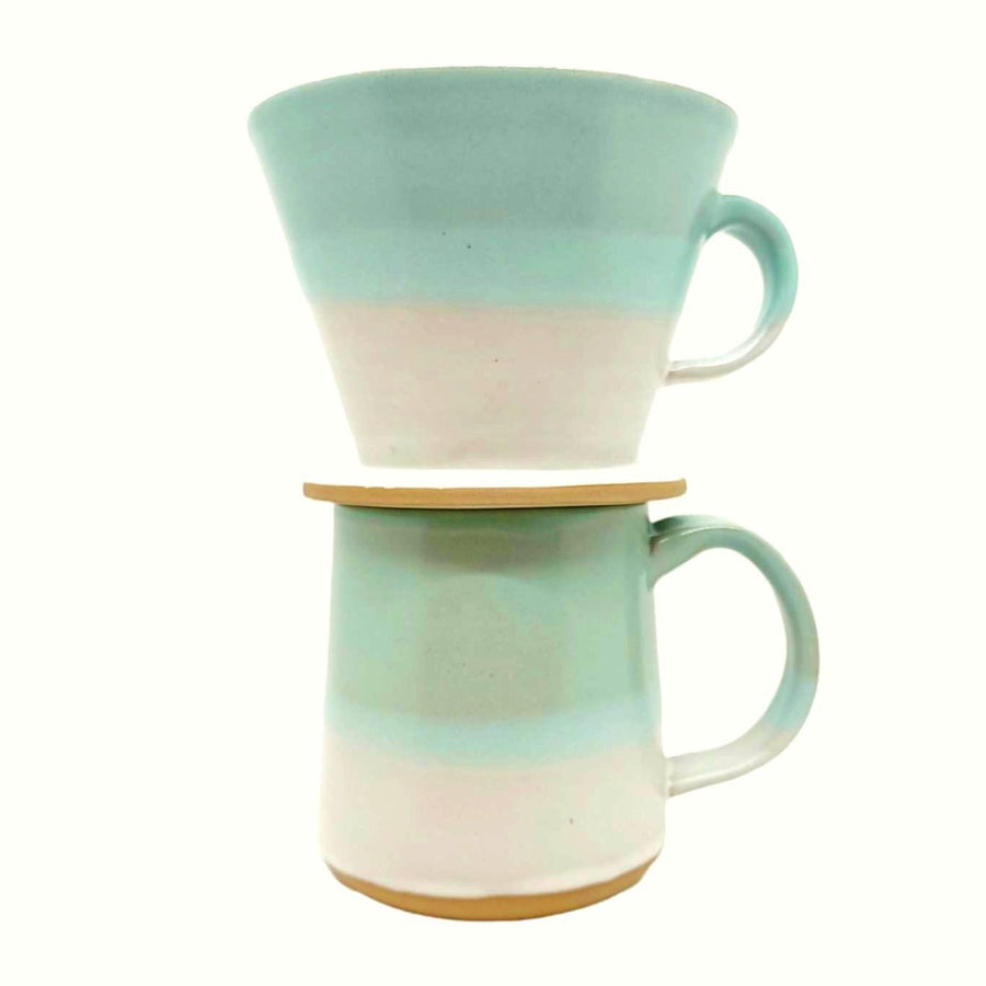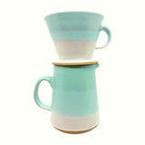 Beautiful and functional, this sturdy ceramic pour-over coffee dripper features an ocean-inspired design in a soothing light blue-green “mint” color. Handmade by a self-declared coffee nerd, the cone is fashoned from stoneware clay and given a gradient glaze design that creates a lighter central “horizon” stripe with gorgeous natural variation making each piece unique. Inner rim on the base keeps it securely in place until your brew is done, and it’s dishwasher safe making it perfect for everyday use.