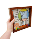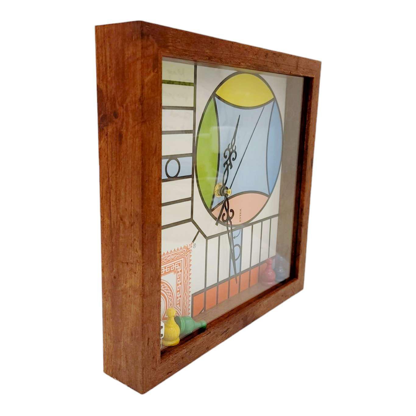 - Materials: Vintage game board and cards, plastic vintage game pieces and dice, clock mechanism, glass and wood frame