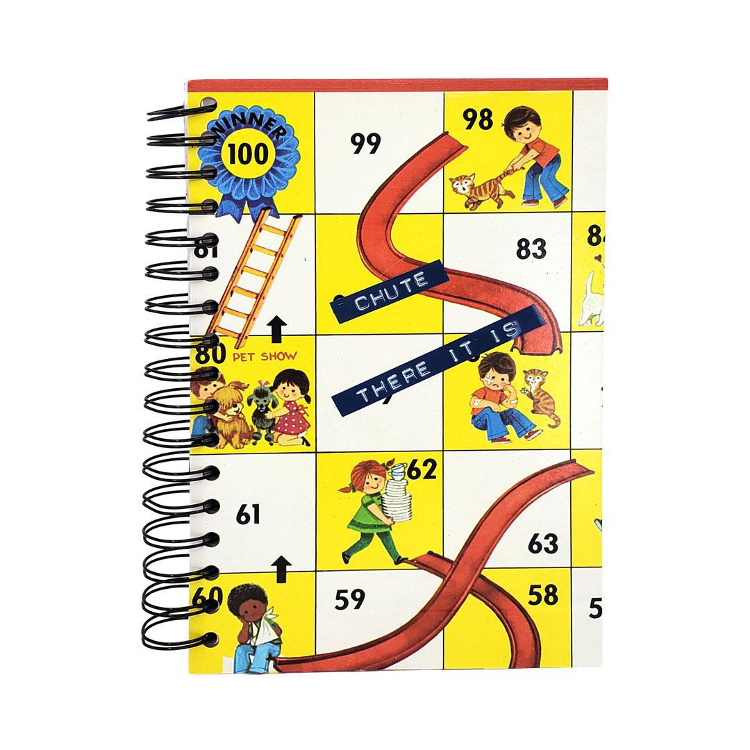 Indulge your nostalgia with this super cool journal handmade from a real vintage board from a game about shortcuts and backsliding! The game board is accented with the words “CHUTE THERE IT IS” printed on retro label maker tape.