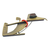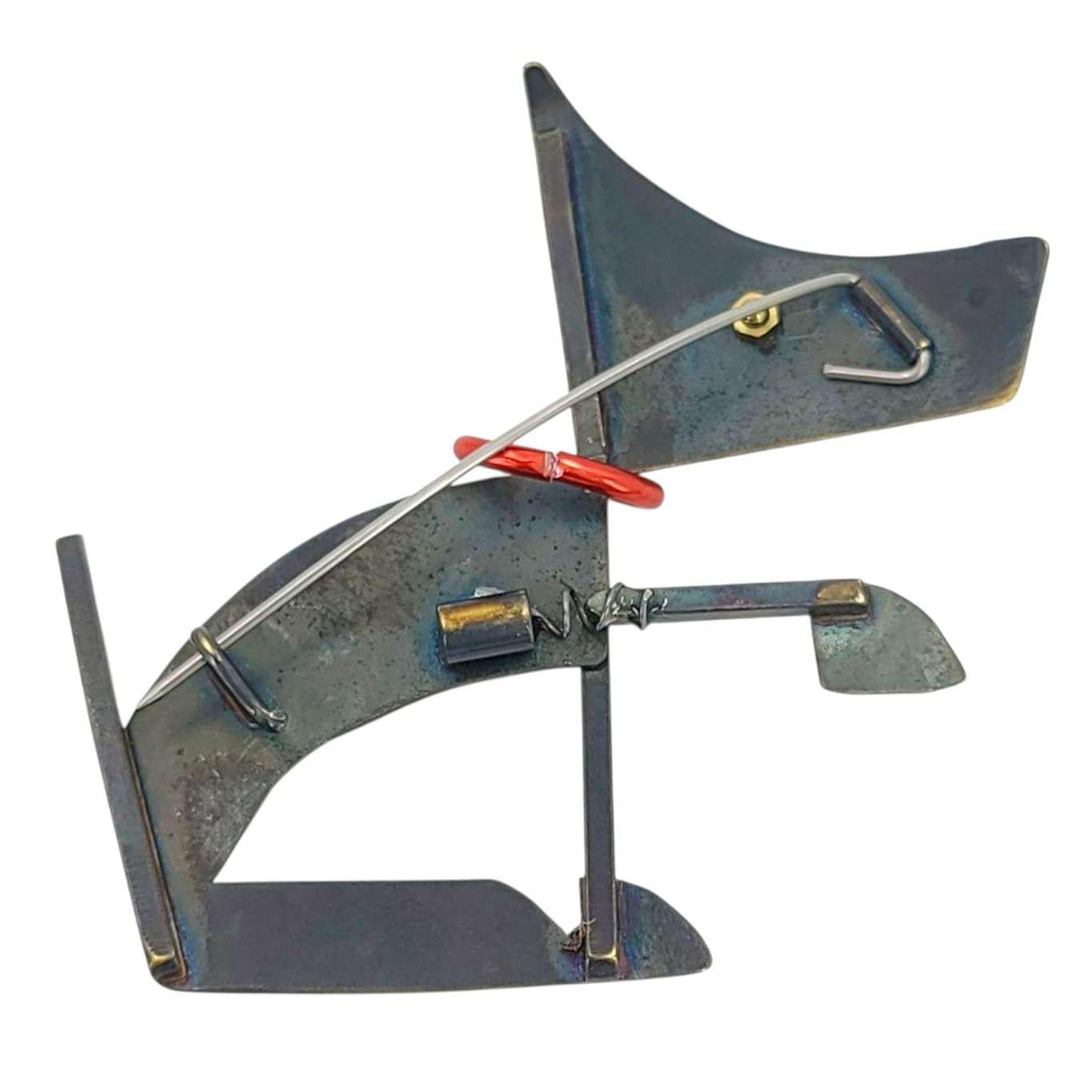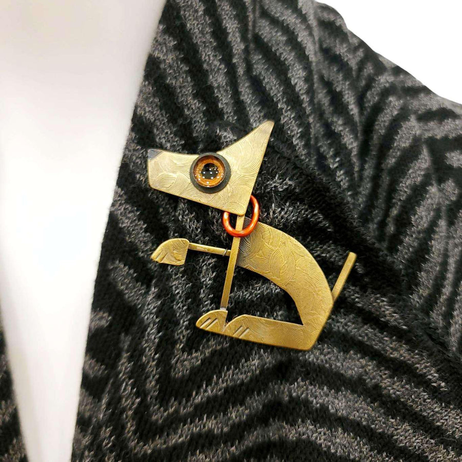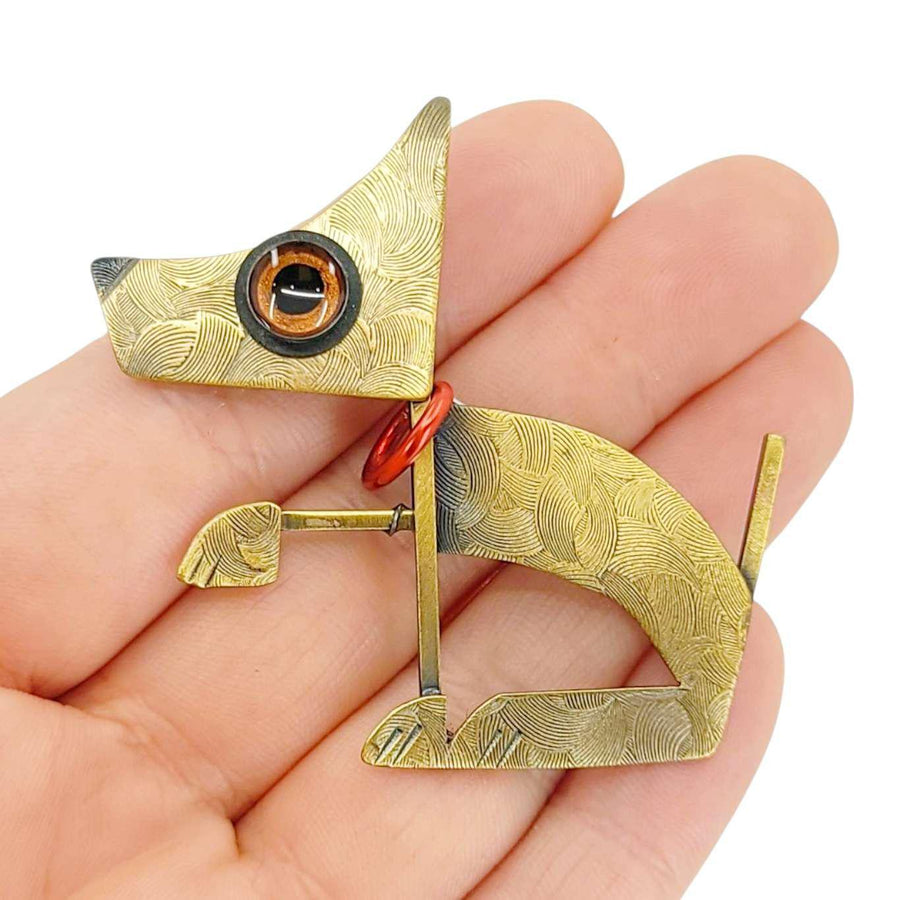 Textured brass, cast resin eye, aluminum collar, and various hinges and springs help this friendly fido reach to shake a paw!