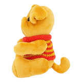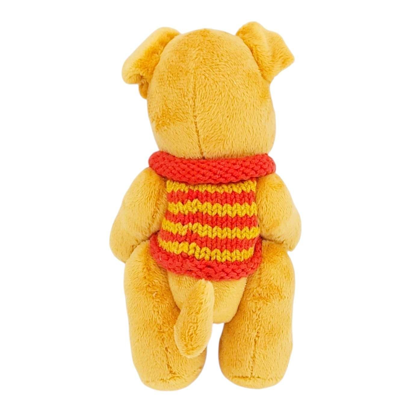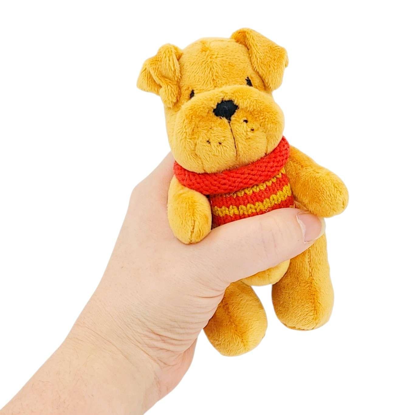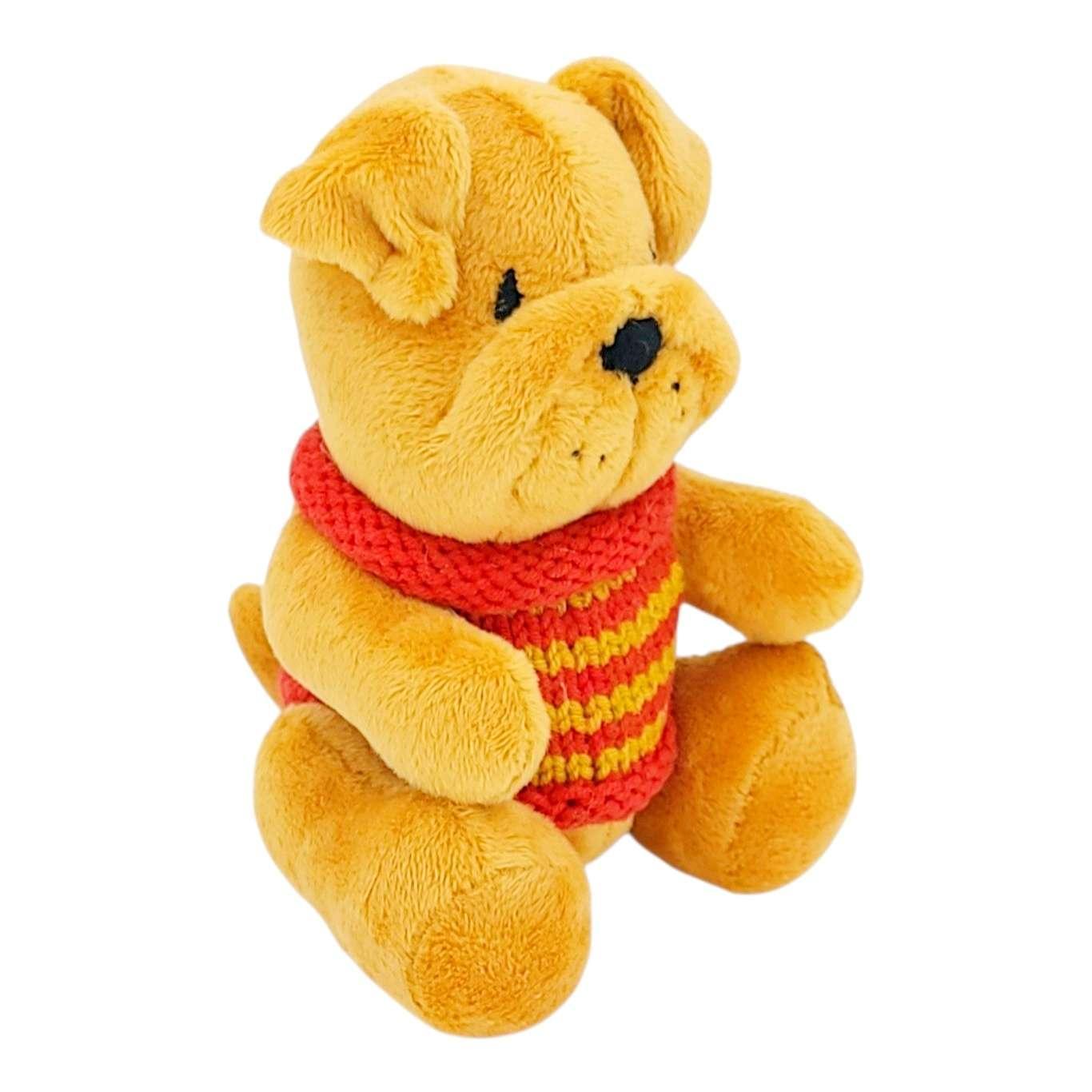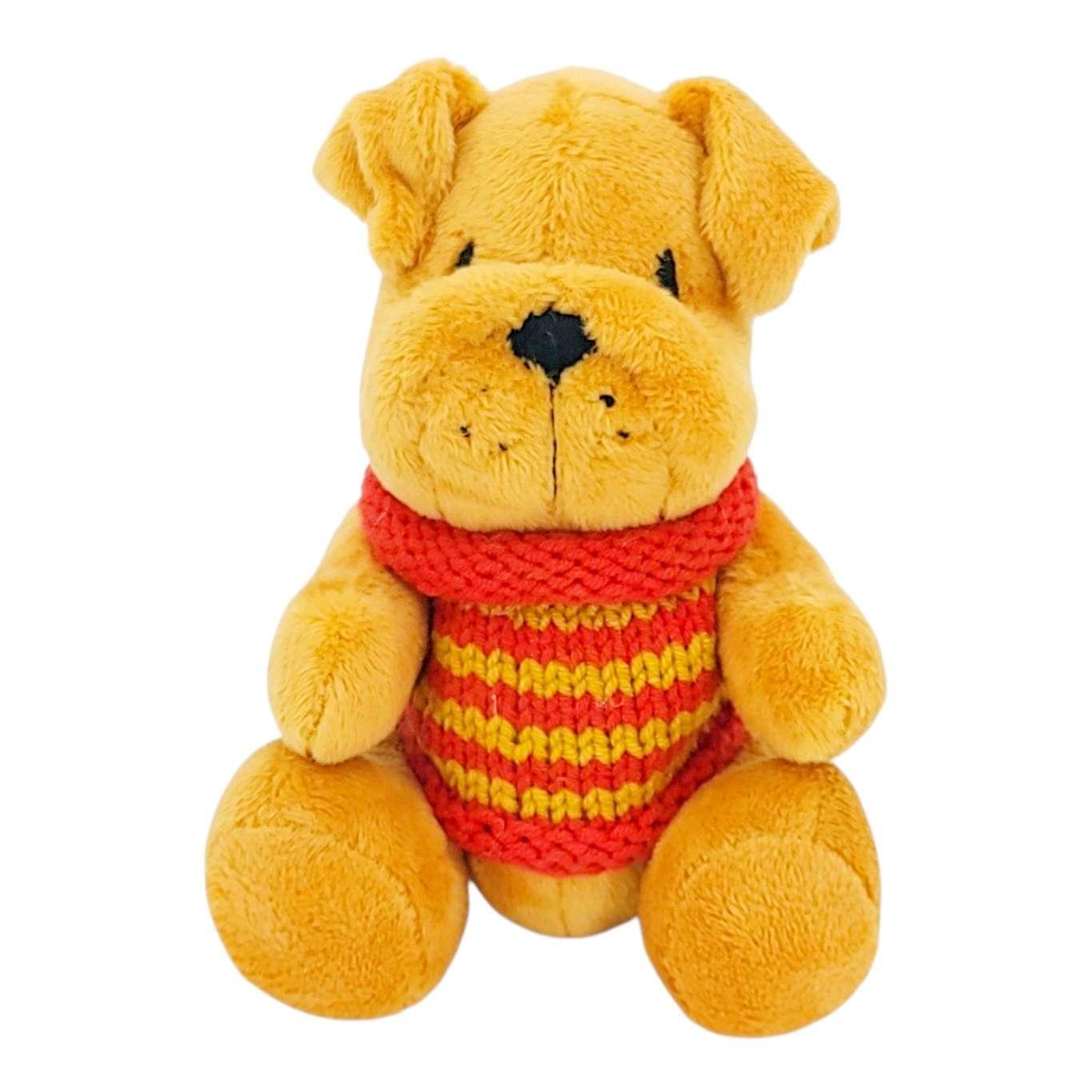 This sweet little tan pup sports an embroidered face, movable arms and legs, soft ears and a wagging tail, and a bright red and yellow striped sweater that was knitted just for them!