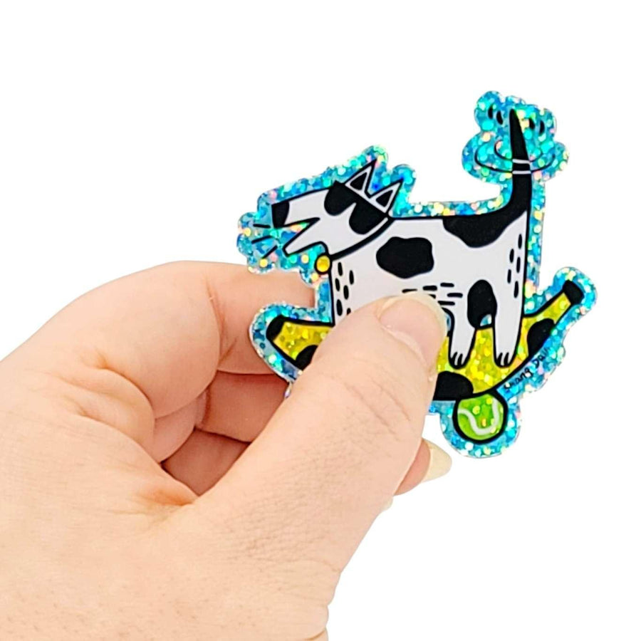 With a cool shades-wearing dog riding a banana skateboard with tennis ball wheels, all on a mega-sparkly blue background... we can safely say this sticker is BANANAS!