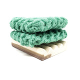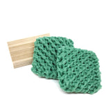 Two (2) long-lasting hand-knit nylon olive green dish scrubbies and one (1) wooden soap dish.