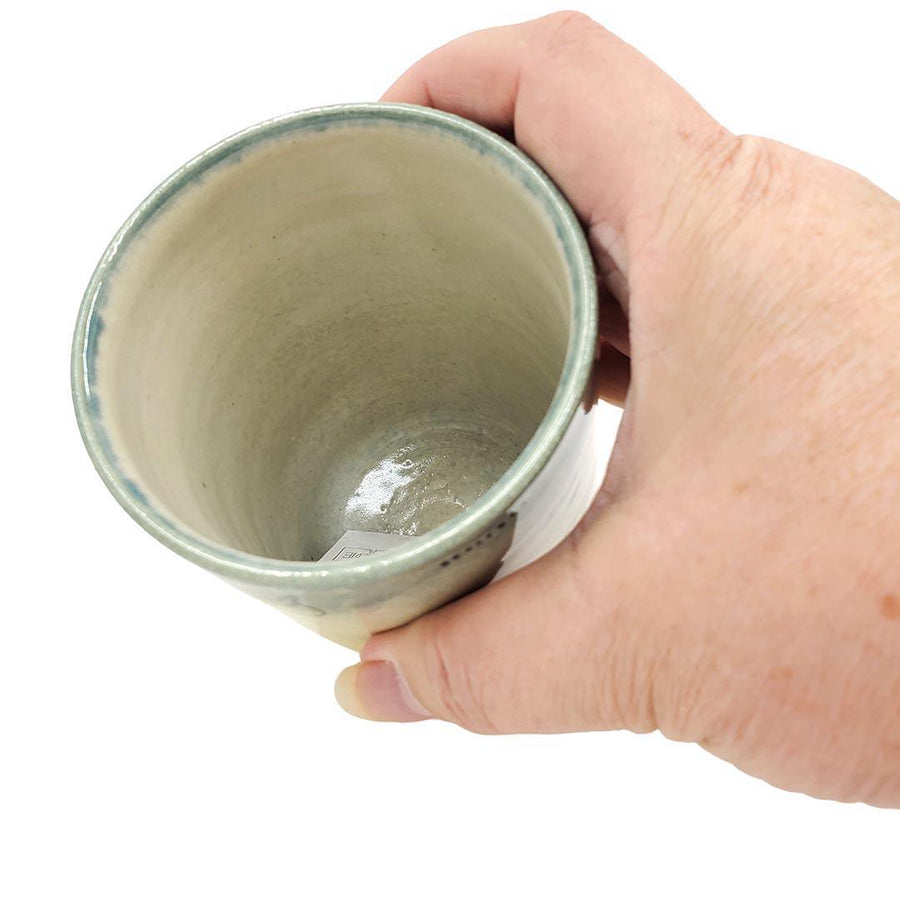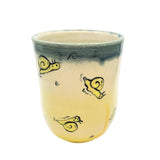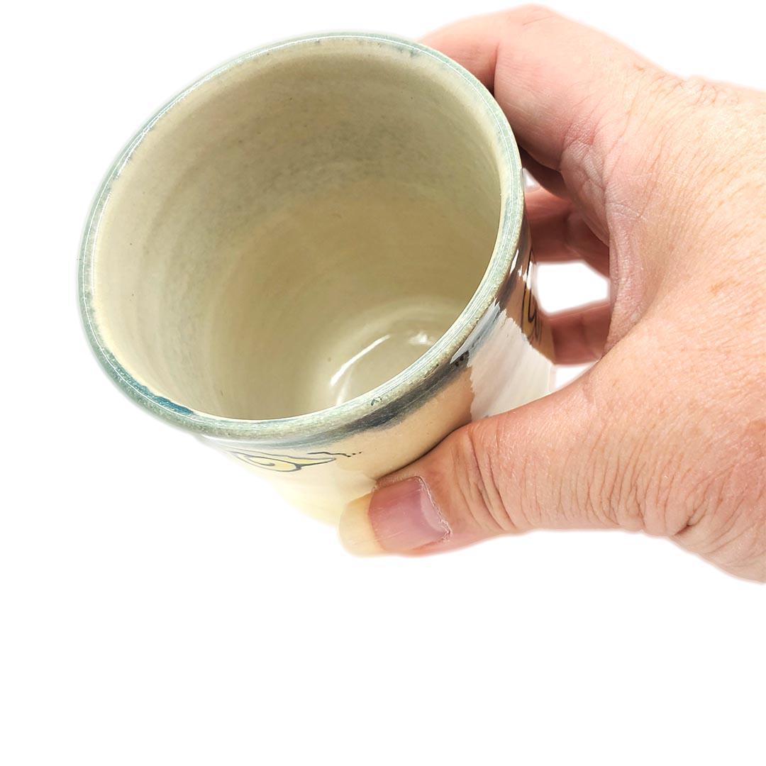 This happy snail cup by Dwadlings turns slow sips into a tiny celebration. Bright yellow and soft green glazes set the scene for a crew of cheerful snails making their way around the cup, reminding you to take things one cozy moment at a time.