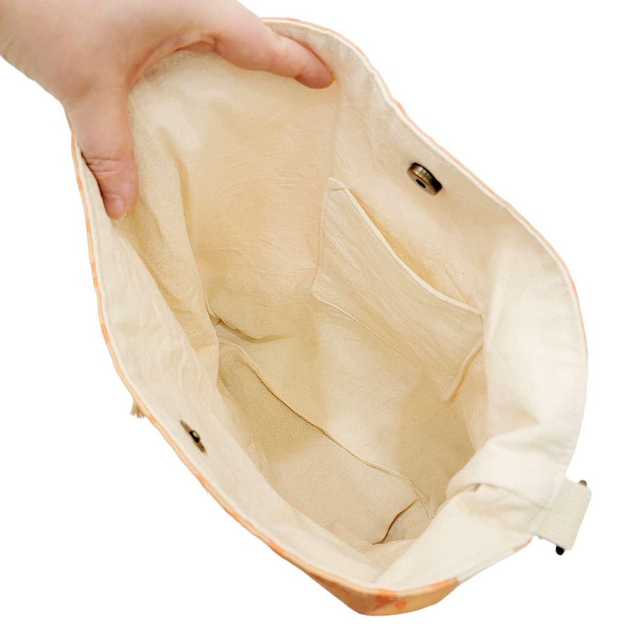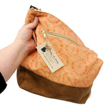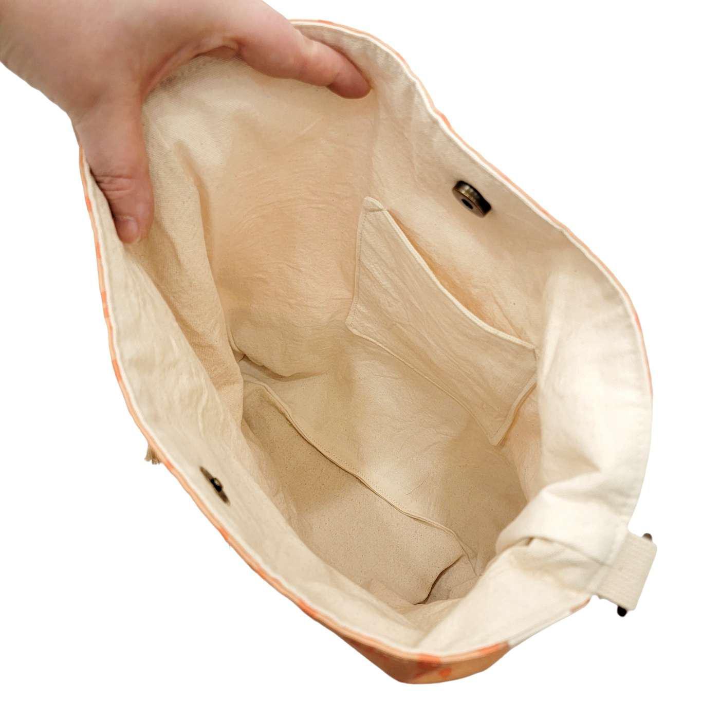 Waxed canvas on the base protects your things from dirt and spills and provides a great accent to the linen/cotton fabric printed with the artist’s own hand-carved block print design.