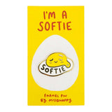 Who knew an egg could have such a sweet face?! Let the world know you're a softie by wearing this pin, featuring a softboiled egg with the word "SOFTIE" across the front.
