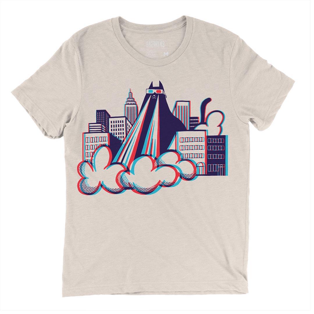 Super soft cotton-poly tee in Heather Dust. Comes with 3D glasses to make the design jump off the shirt...
