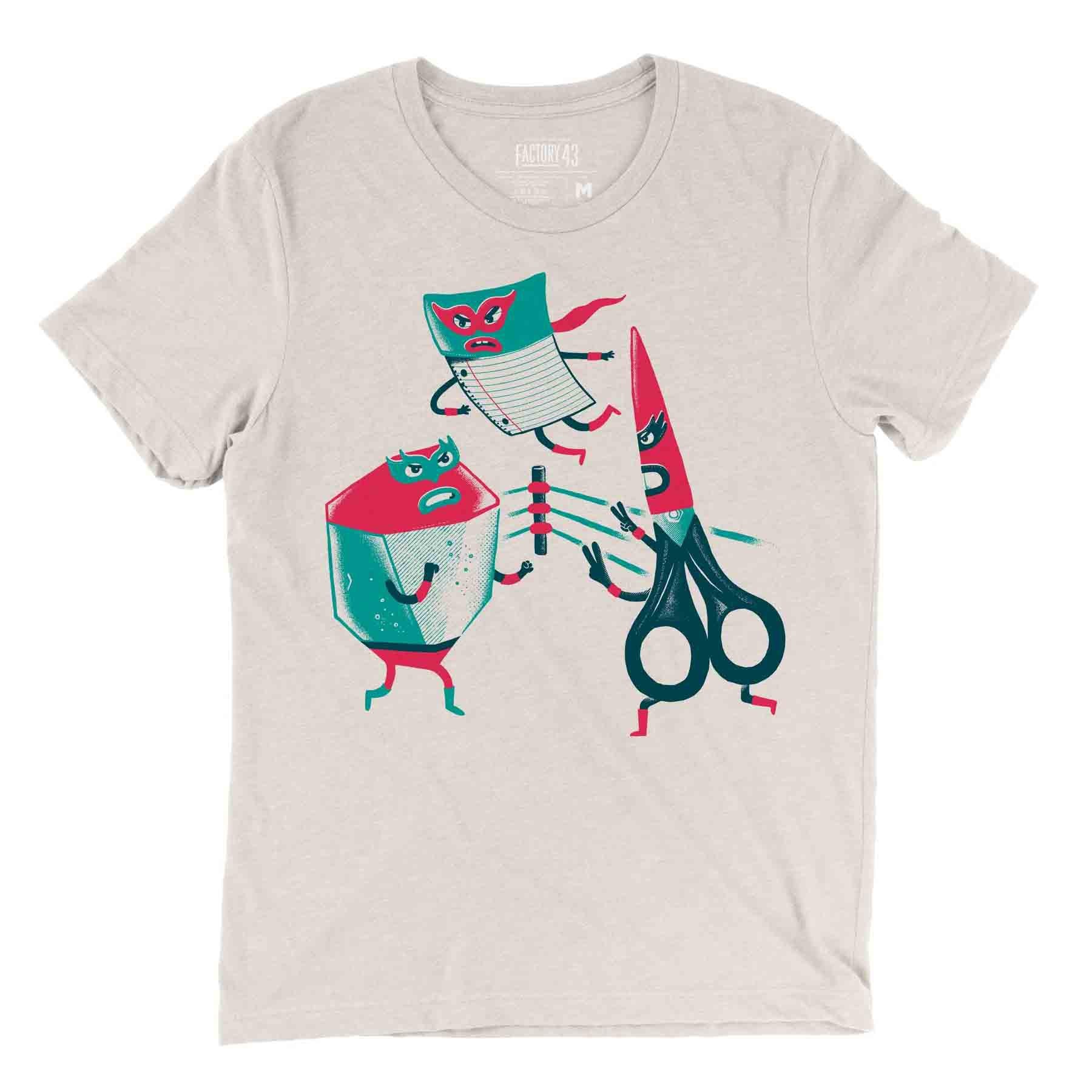 Let's get ready to rumble! Rock, Paper and Scissors square off in the ring to settle things once and for all. You'll be the winner hands down in this cool, comfy tee. This original illustration is screenprinted on a super-soft triblend tee in heather dust tan.