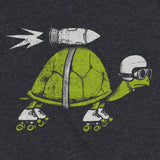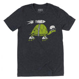 This Rocket Turtle isn't wasting any time getting to the finish line? This hand drawn illustration is printed in water based inks on the softest charcoal gray tee triblend t-shirt.