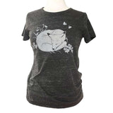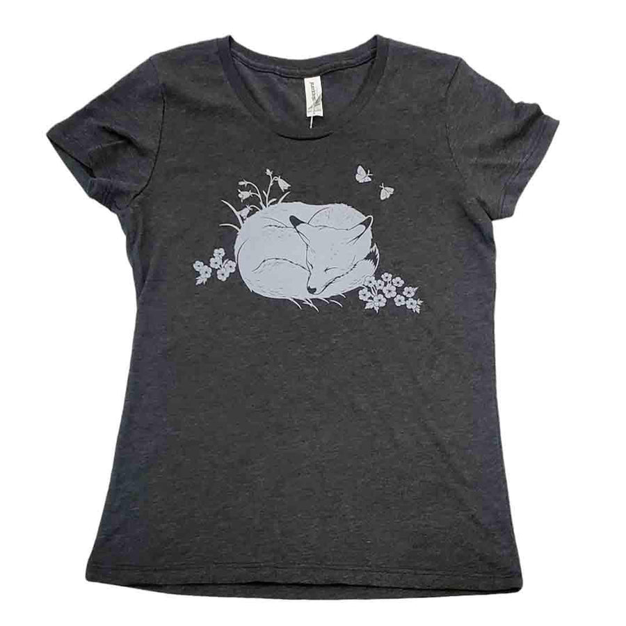 A sweet little fox naps peacefully on the front of this ultra-comfortable slim-fit short-sleeved shirt, surrounded by wildflowers and butterflies. Screen-printed by hand in white ink on a dark gray background. Shirt has a contoured shape with a crew neck and short sleeves.