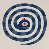 A swirly snake with a hypnotic eye is printed in waterbased ink on a cozy-soft heather dust colored triblend t-shirt.