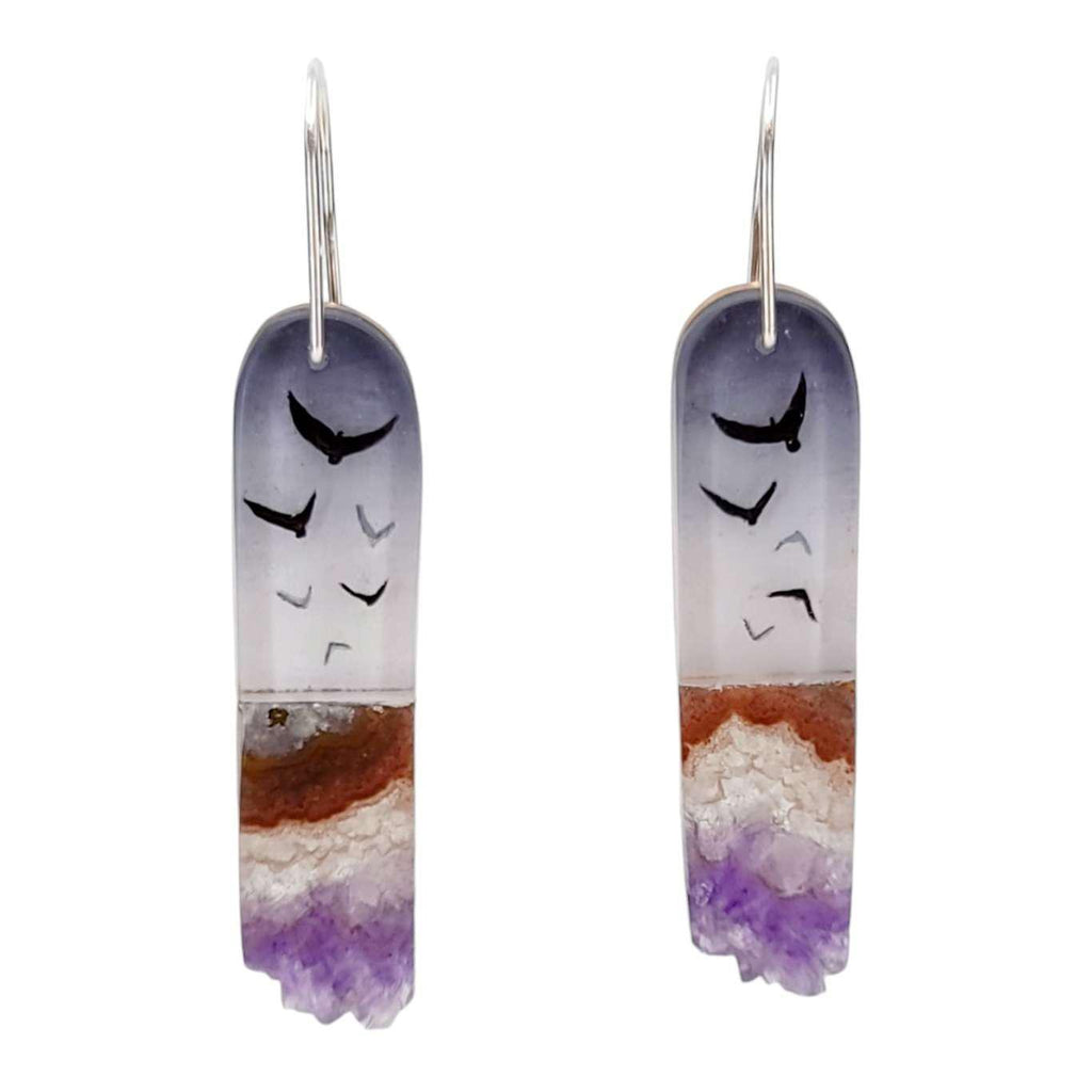 A silhouetted flock of birds in clear sky above genuine amethyst crystal slices highlighted with red and gray toned striations.