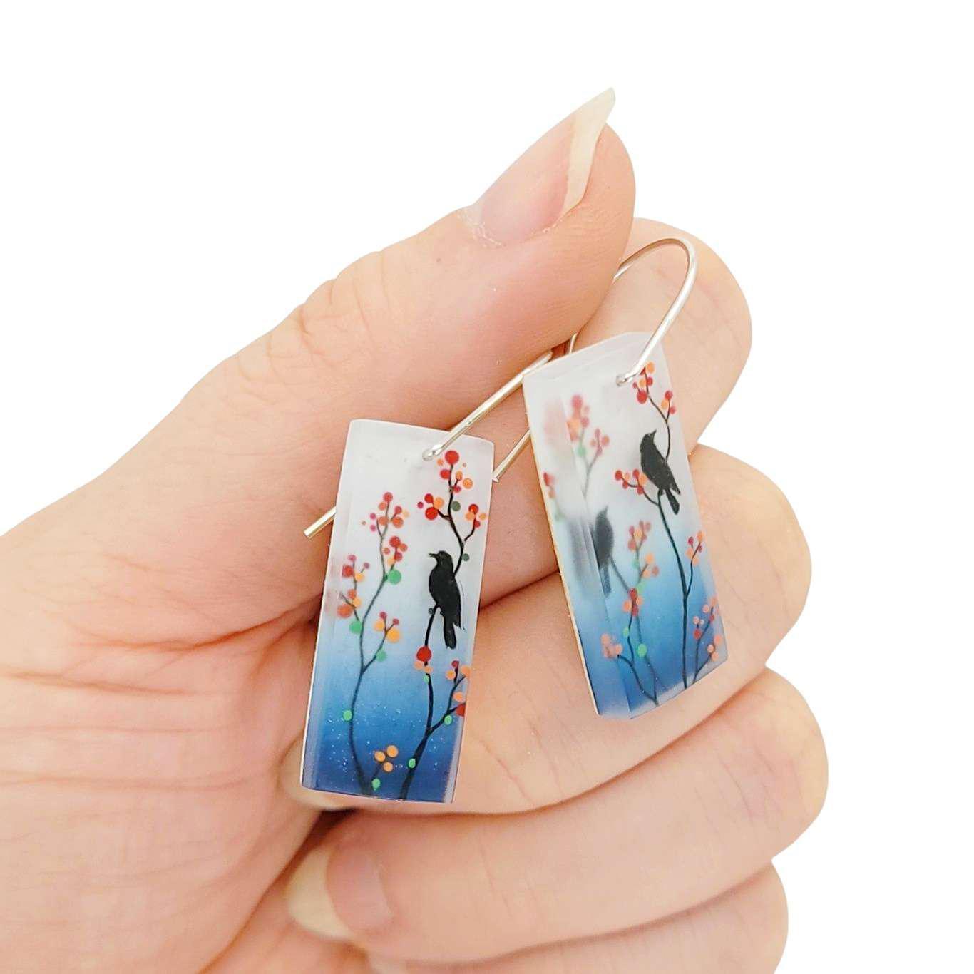 These long drop earrings feature silhouetted birds on branches festooned with red and pink berries.