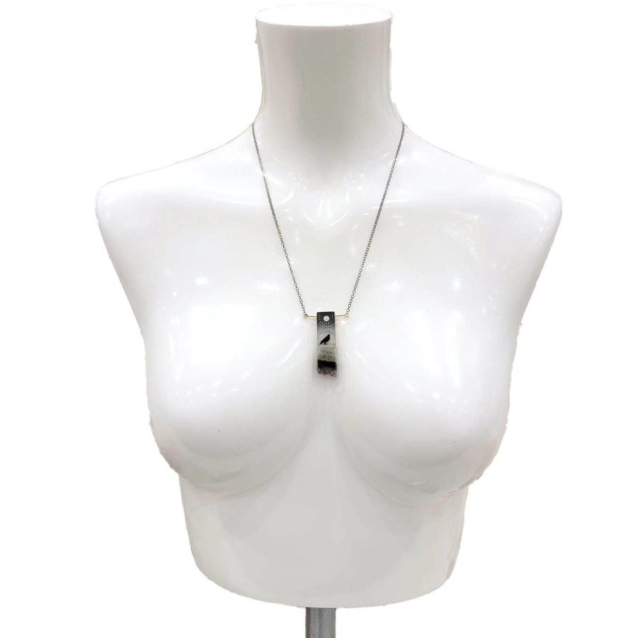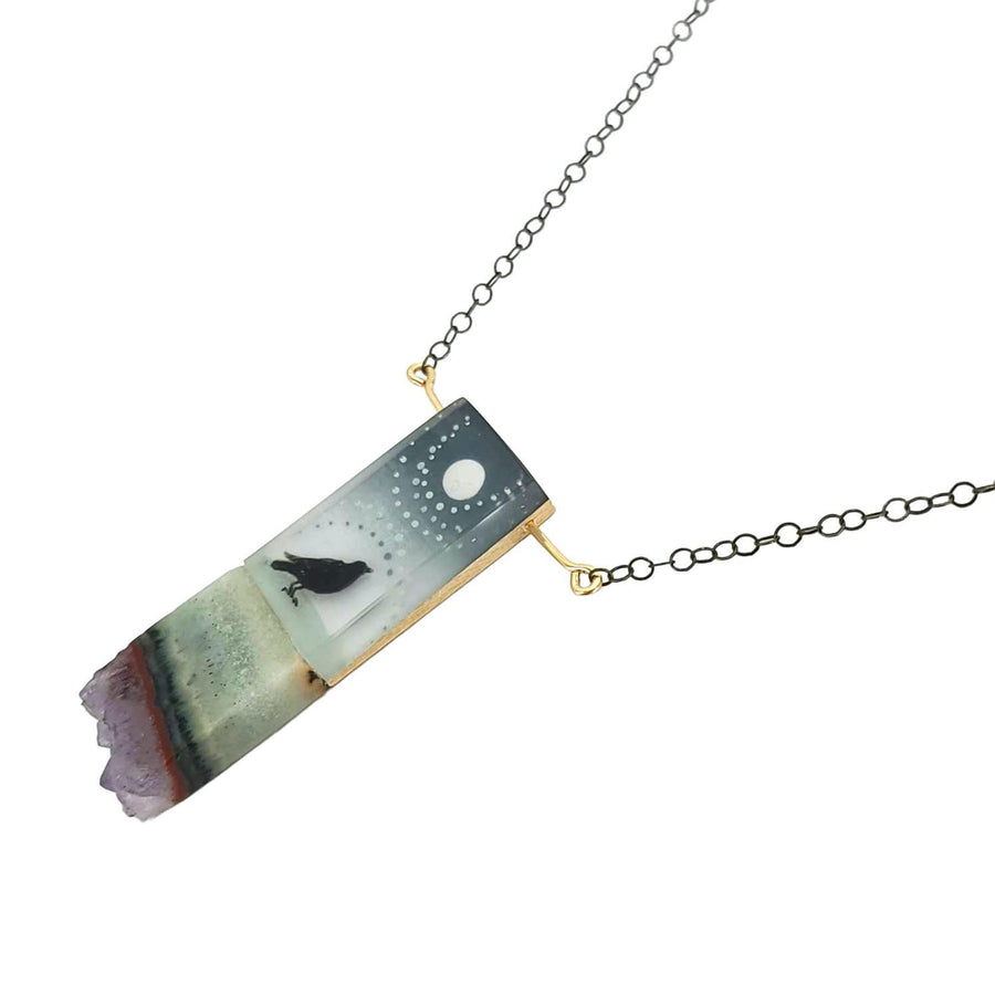 This stunning necklace features a crow silhouetted against a gradient sky with moon and dot decoration, all accented with a slab of amethyst/jasper.