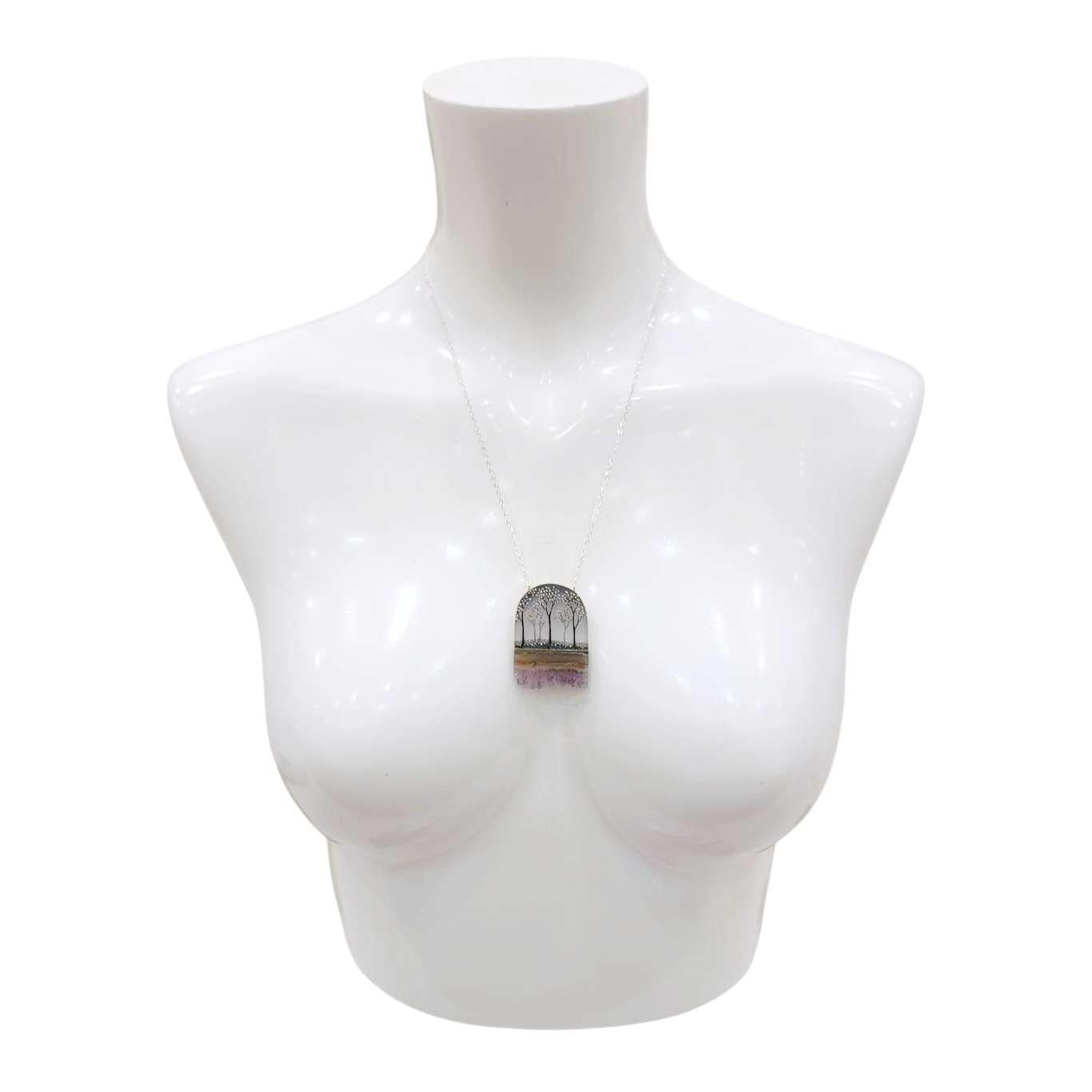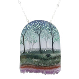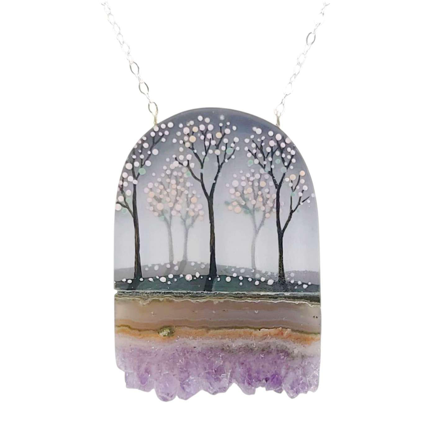 This stunning necklace features a pink or green blooming forest against a gradient sky, accented by a slab of real amethyst.